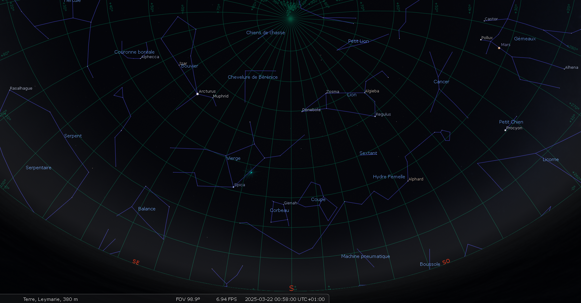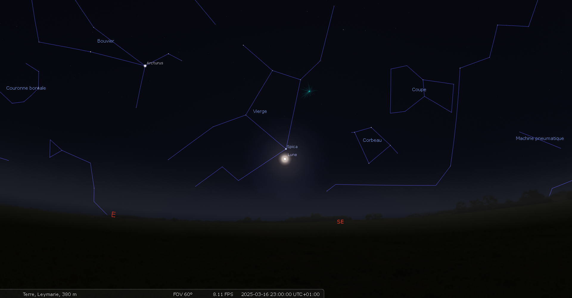 Ce soir, pour notre localisation, Spica se lève à 21h21 et la Lune à 21h28.