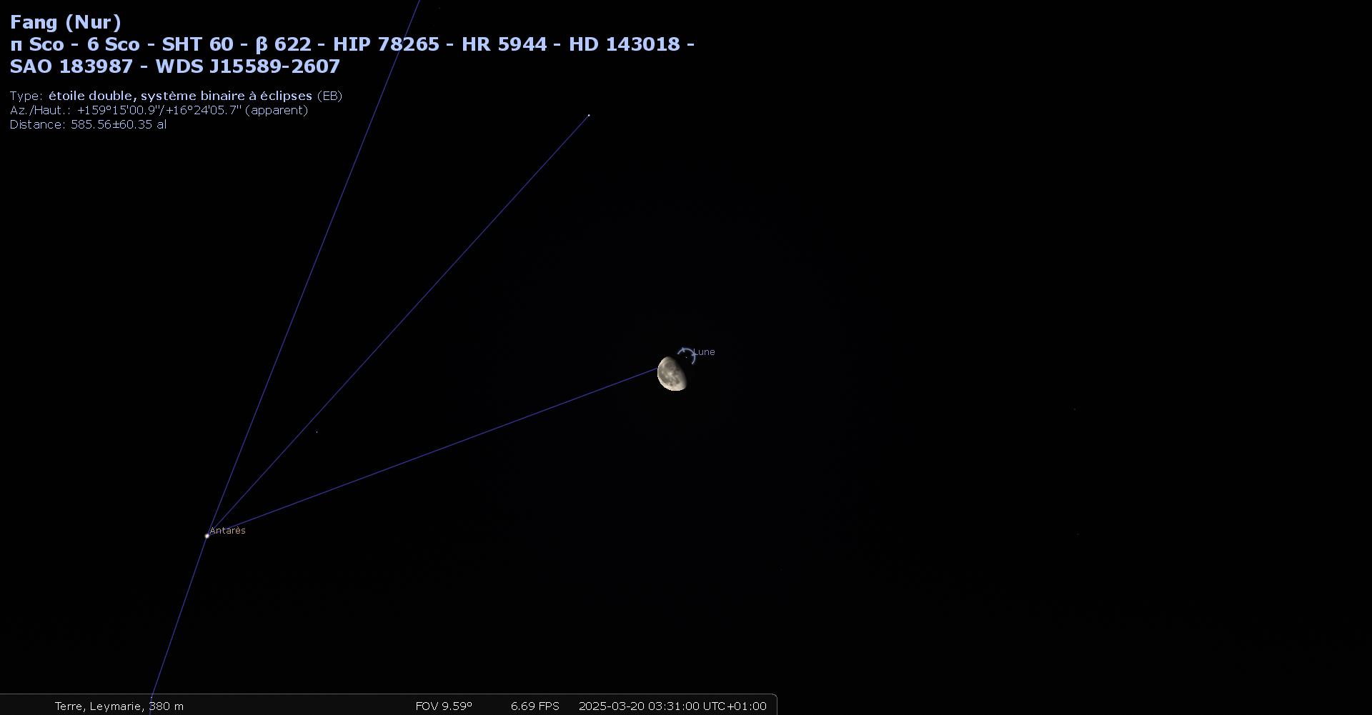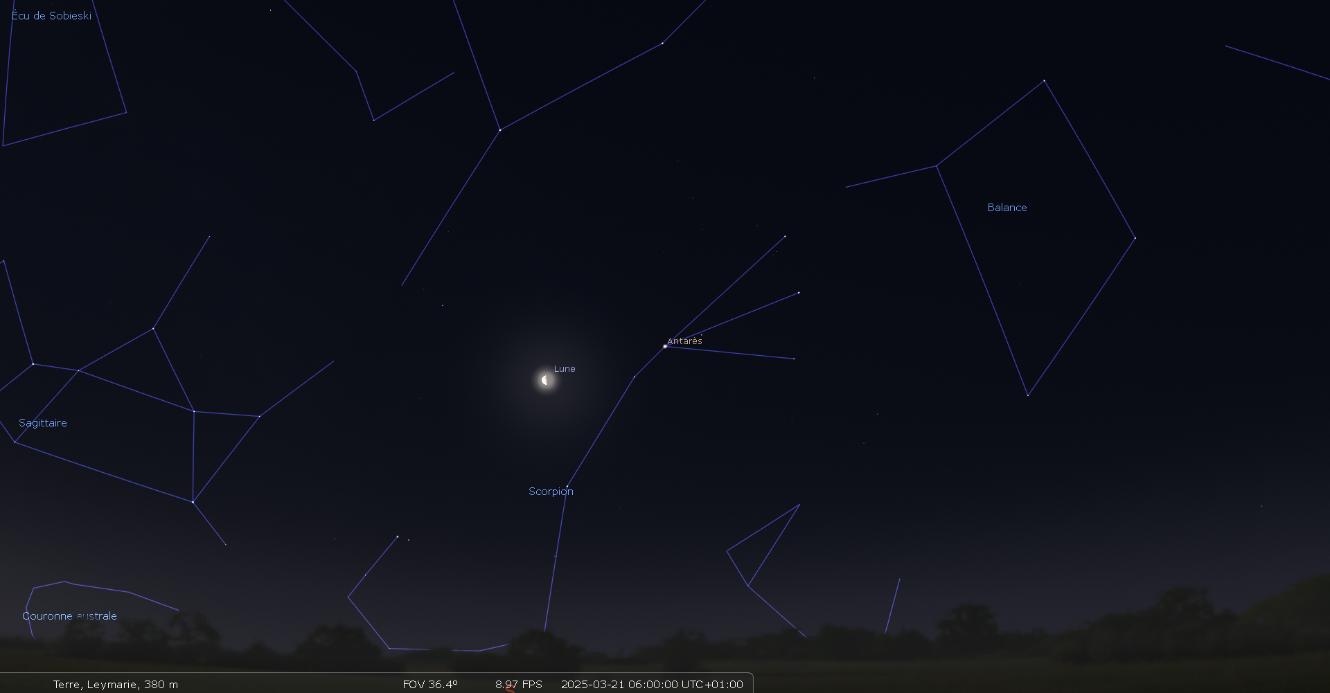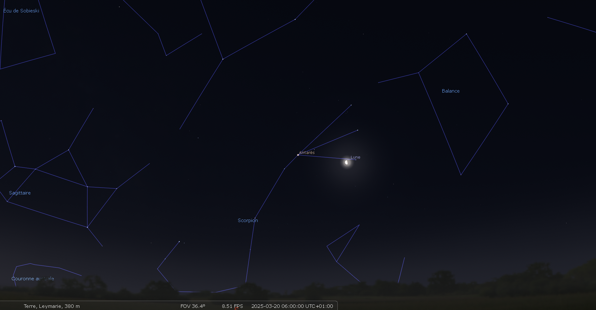 Pour notre localisation, le 20, la Lune se lève à 0h46 et Antarès à 1h25 ;