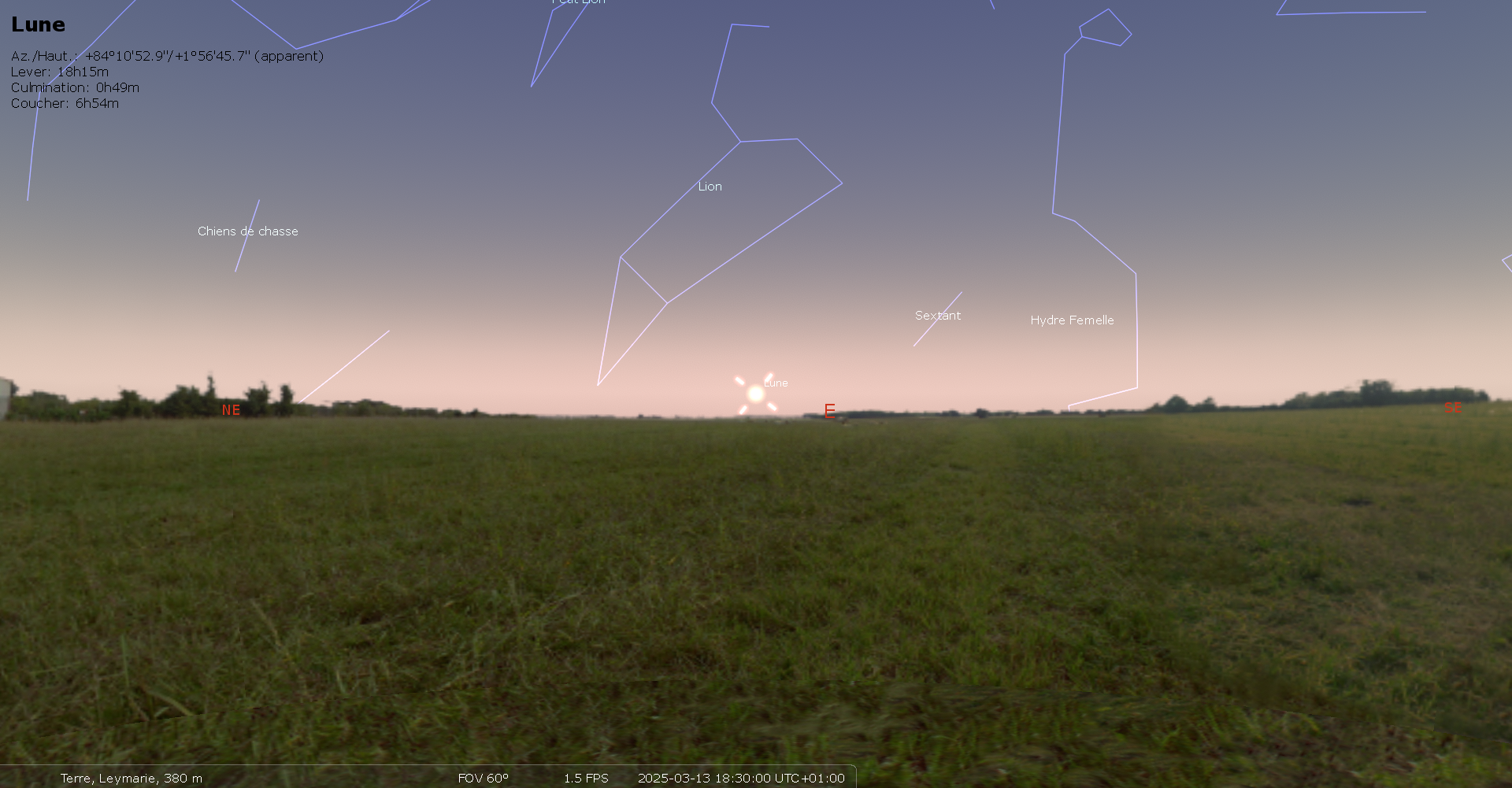 Le 13 mars au soir, la Lune se lève pratiquement à l’Est, à 18h15 pour notre localisation, soit 40 minutes avant le coucher du Soleil,