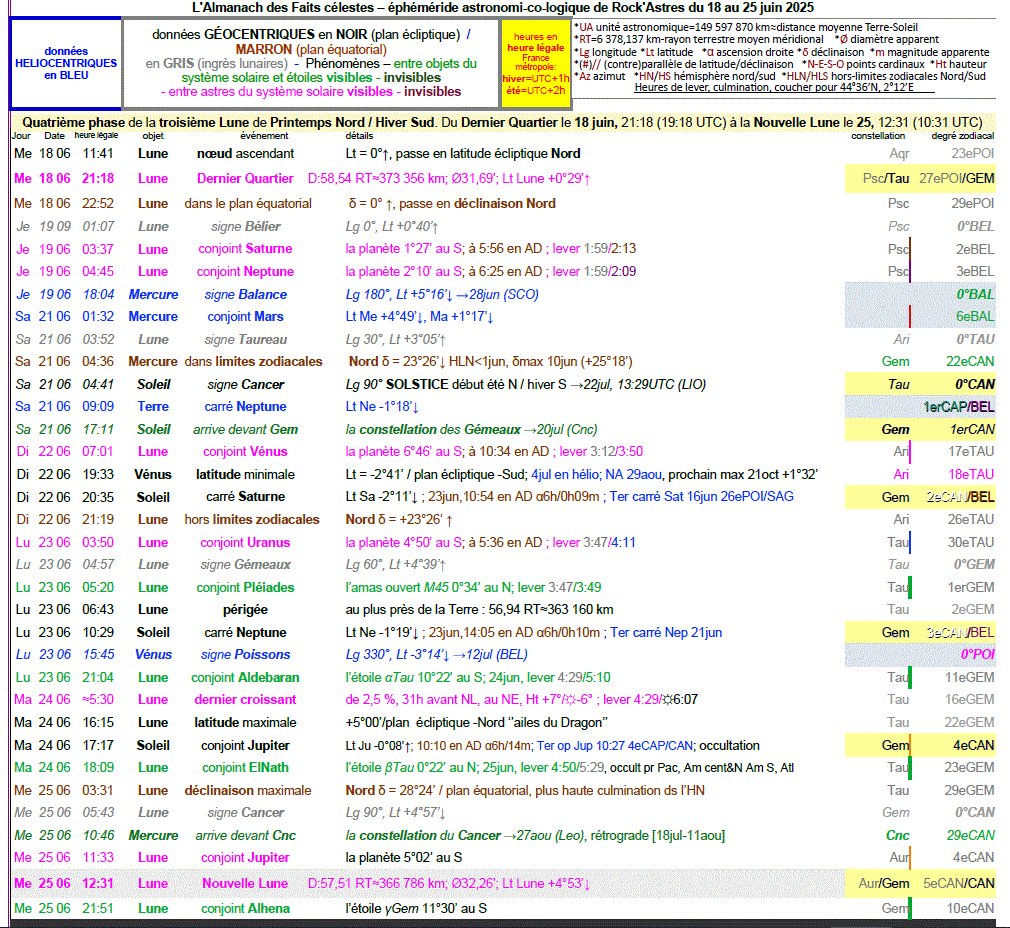 - A 4h45, la Lune est conjointe à Neptune dans le plan écliptique, la planète 2°10’ au Sud ; longitude 2°06’ (3e BEL).