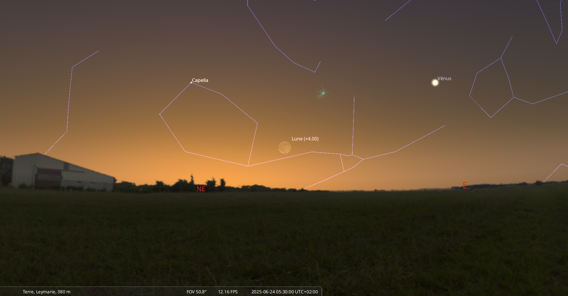 Le 25 juin, pour notre localisation, Elnath se lève à 4h50 et la Lune à 5h29.
