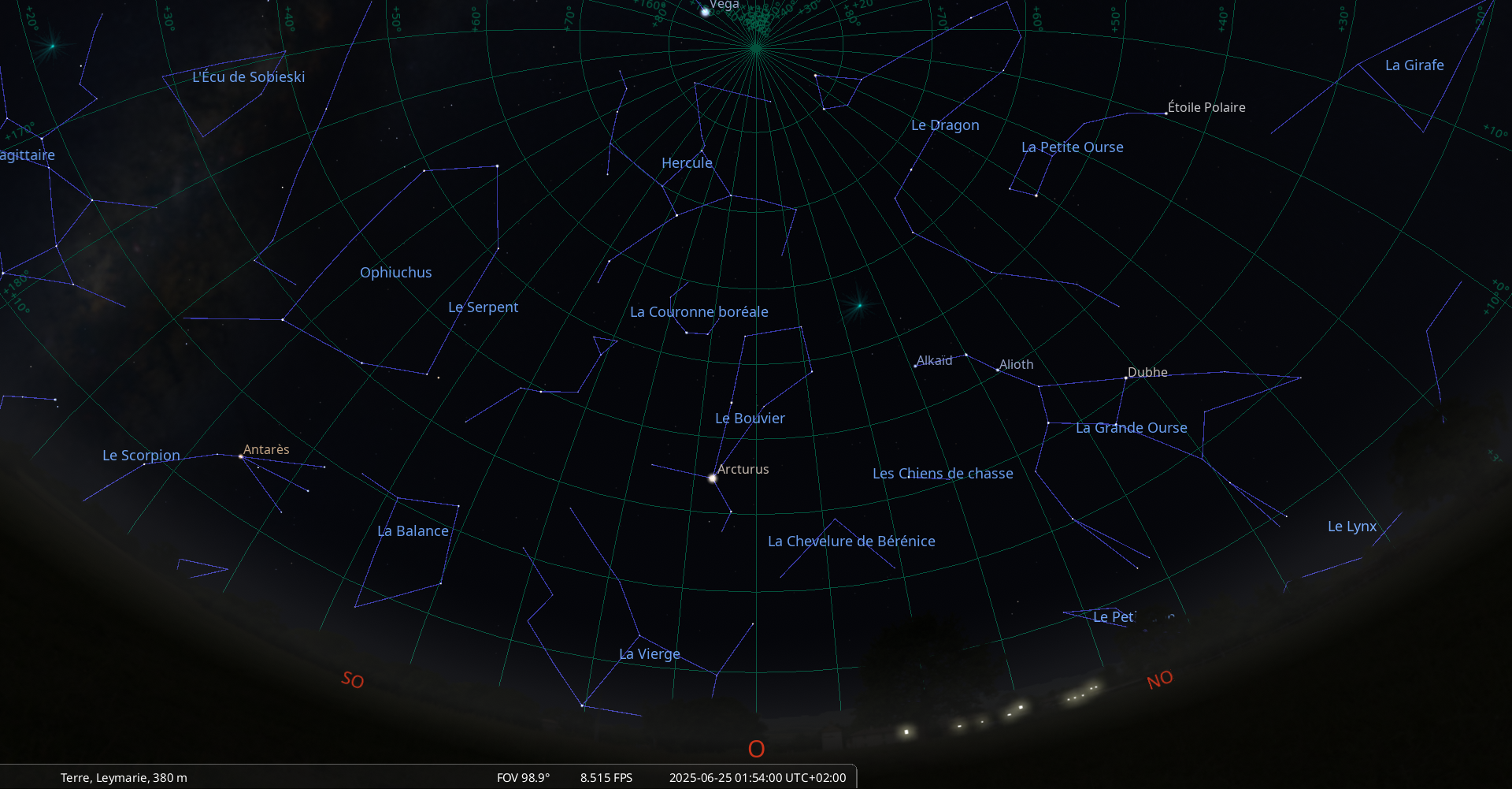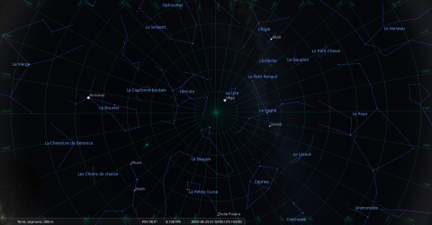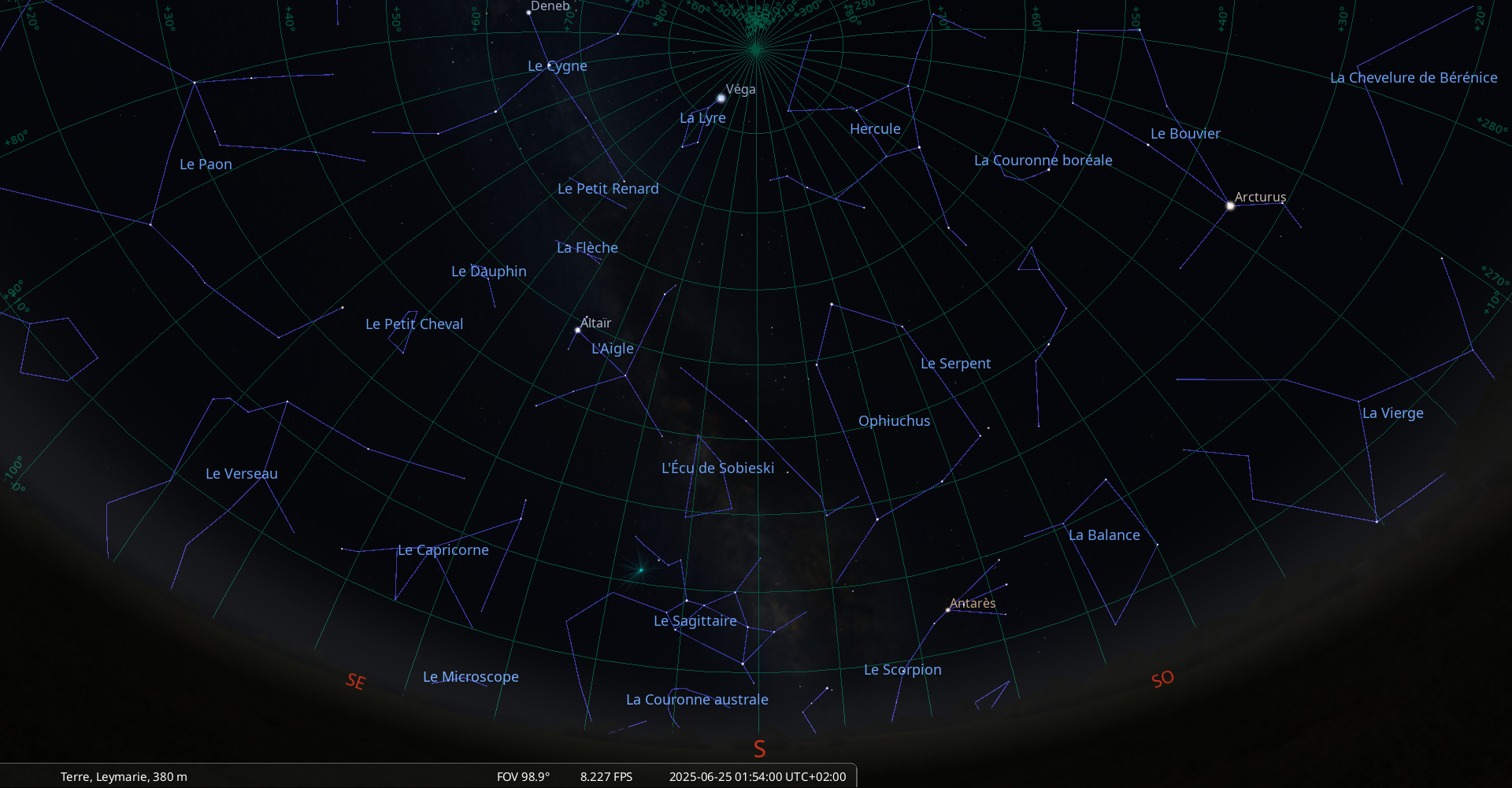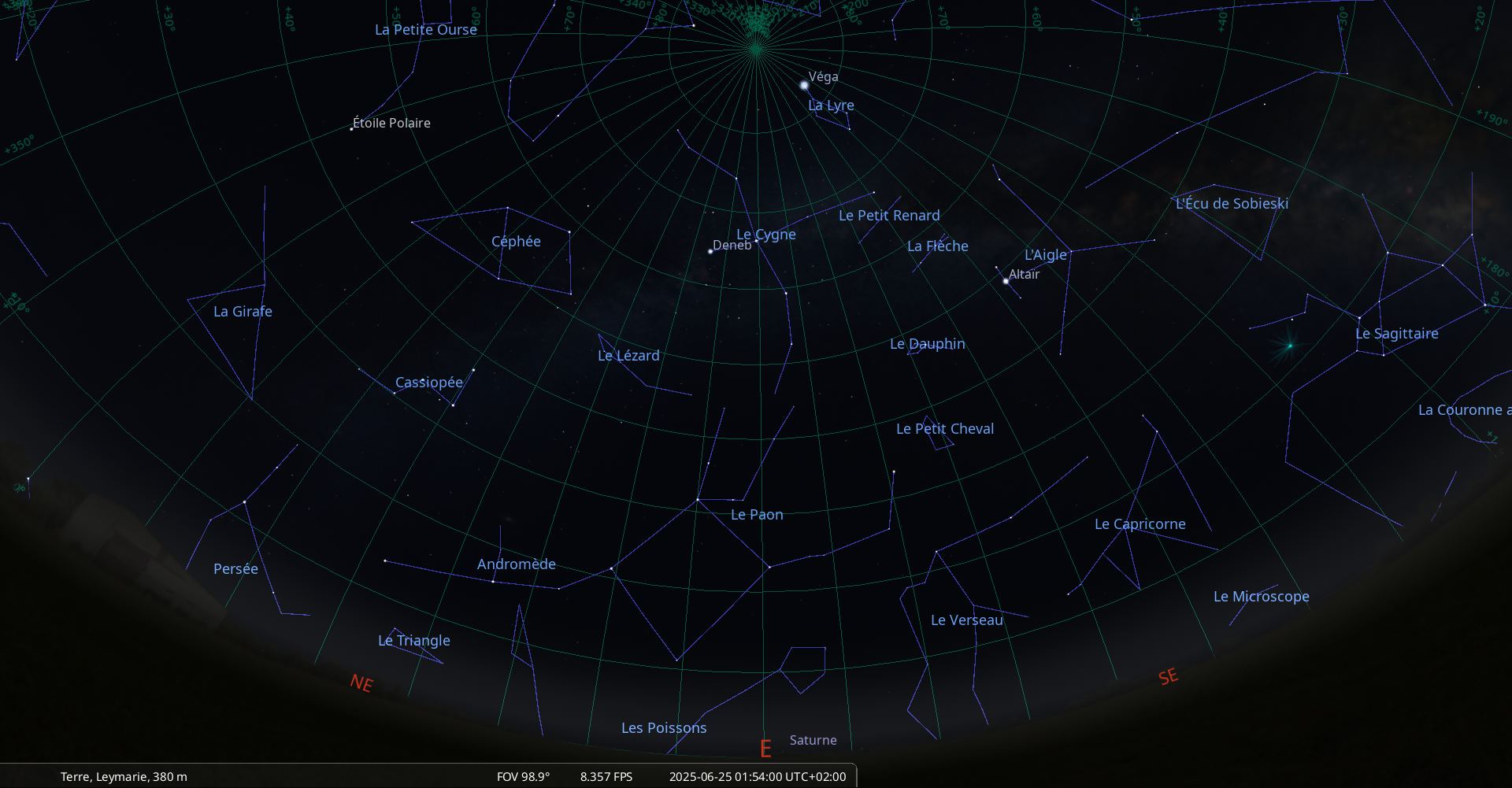 Elle culmine au plus haut dans l’hémisphère Nord, à 73° de hauteur à notre latitude (44° Nord),