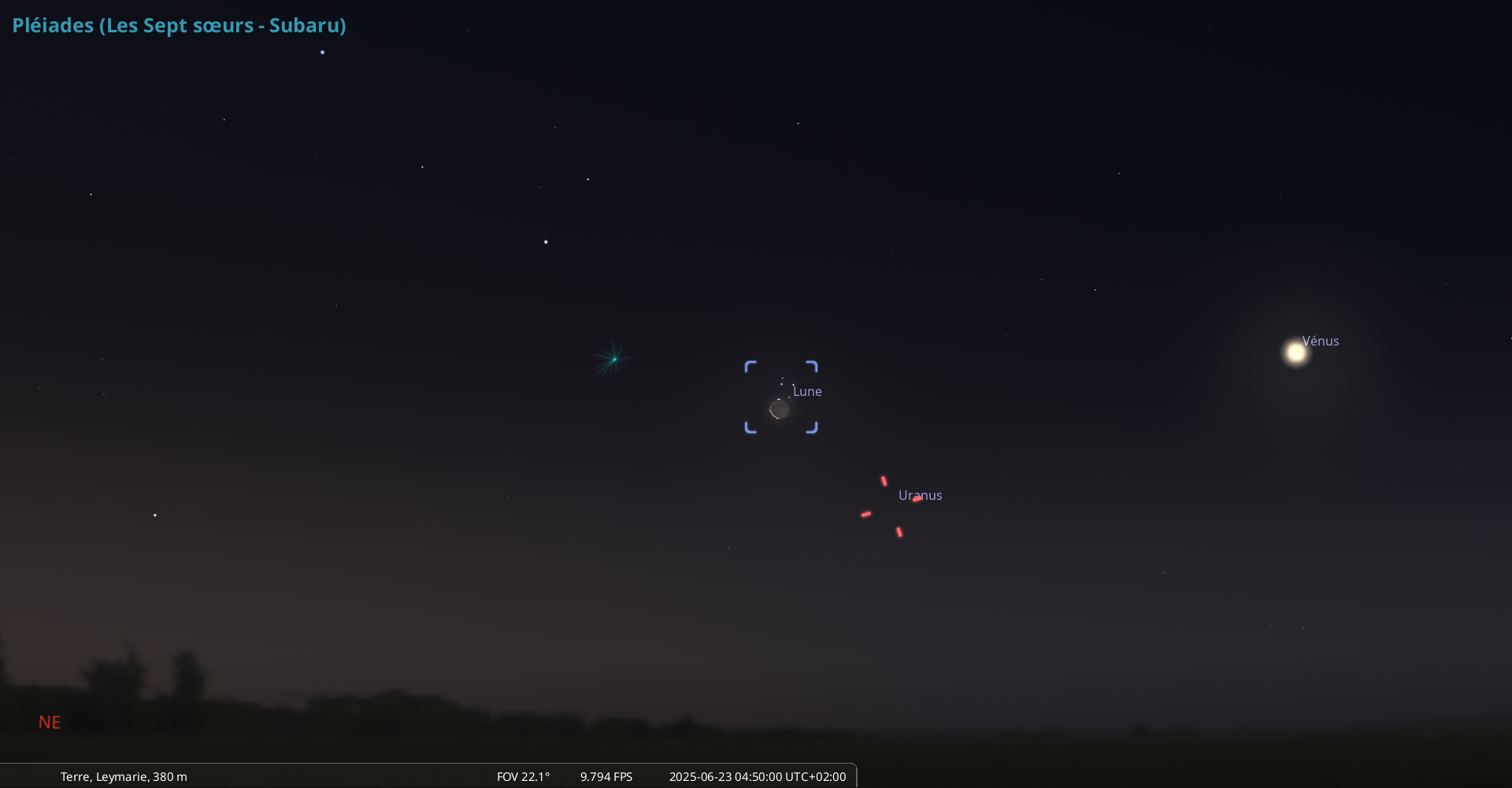 Aujourd’hui, pour notre localisation, les Pléiades se lèvent avec la Lune, à 3h49, en compagnie d’Uranus, invisible.
