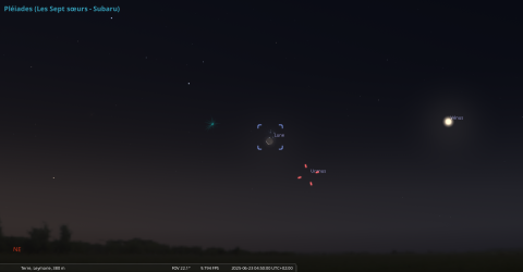 - A 5h20, la Lune est conjointe aux Pléiades dans le plan écliptique, l’amas ouvert (Messier 45) 0°34’ au Nord.