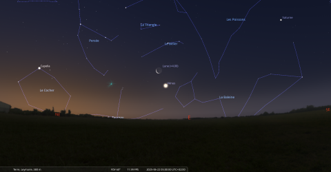 Le 24 juin, pour notre localisation, le dernier croissant de Lune se lève à 4h29 et Aldébaran, invisible, à 5h10.