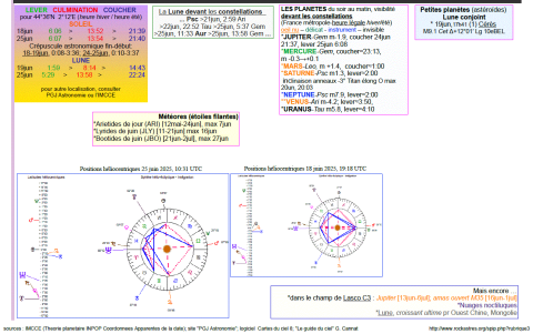 Ciel du mois ; Phénomènes astronomiques ; Visibilité de la Lune et des planètes ; Cartes du ciel