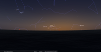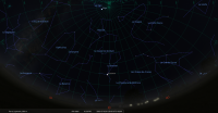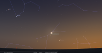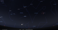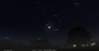 - A 3h03, la Lune est conjointe à Mars dans le plan équatorial, la planète 0°12’ au Sud ; élongation solaire de Mars 58° Est