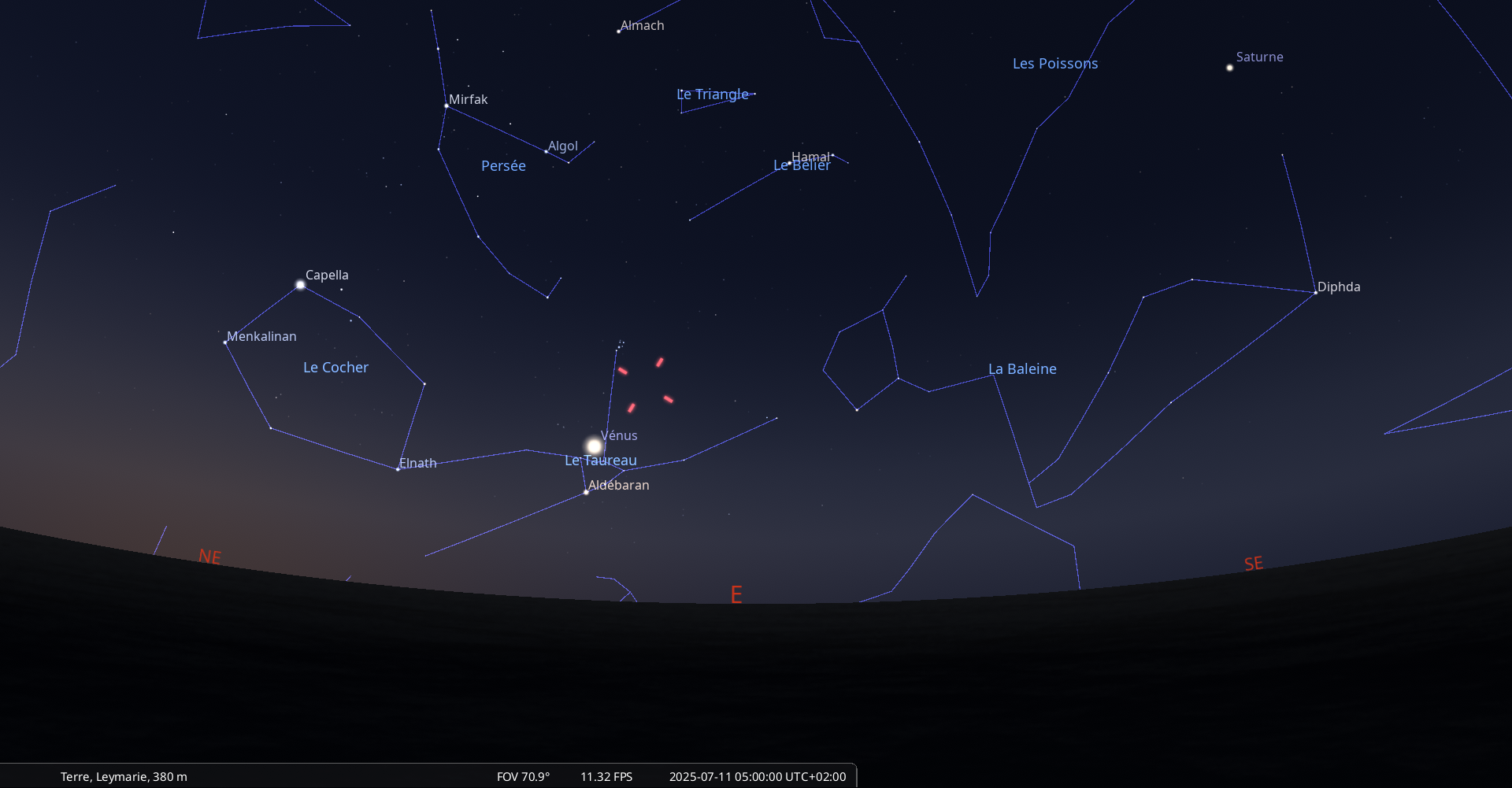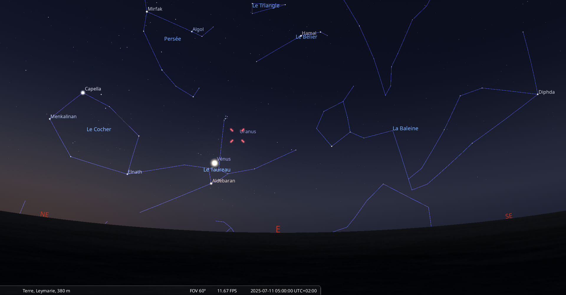 – A 14h45, Vénus conjoint Uranus en géocentrique dans le plan écliptique