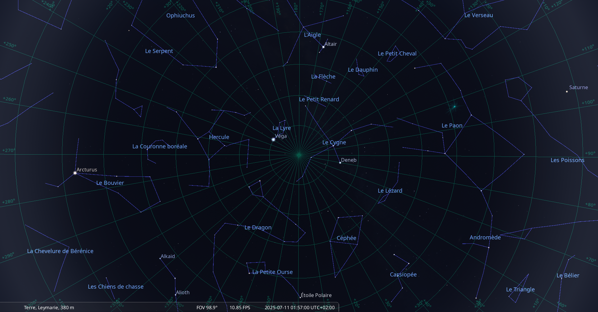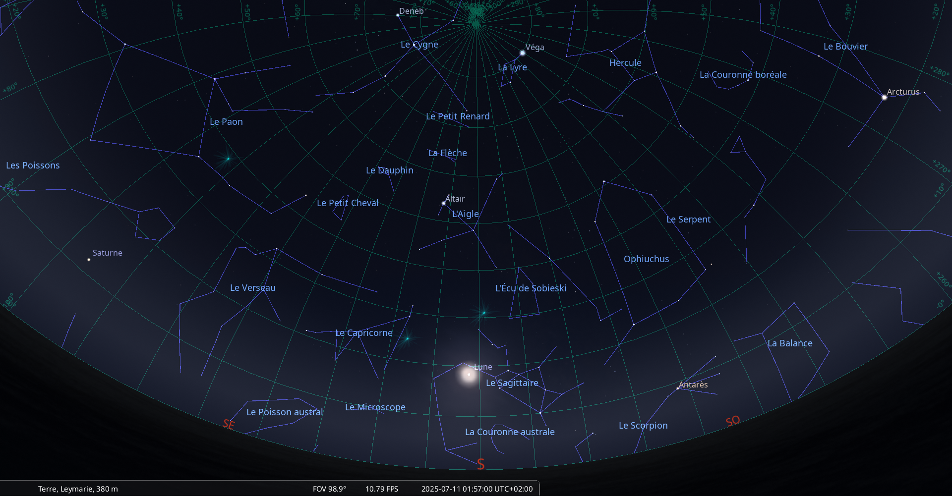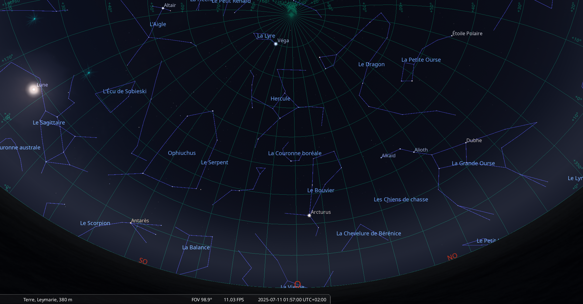 à 16° de hauteur pour la latitude 45°N, le 9 juillet à 0h18 au méridien de Paris.