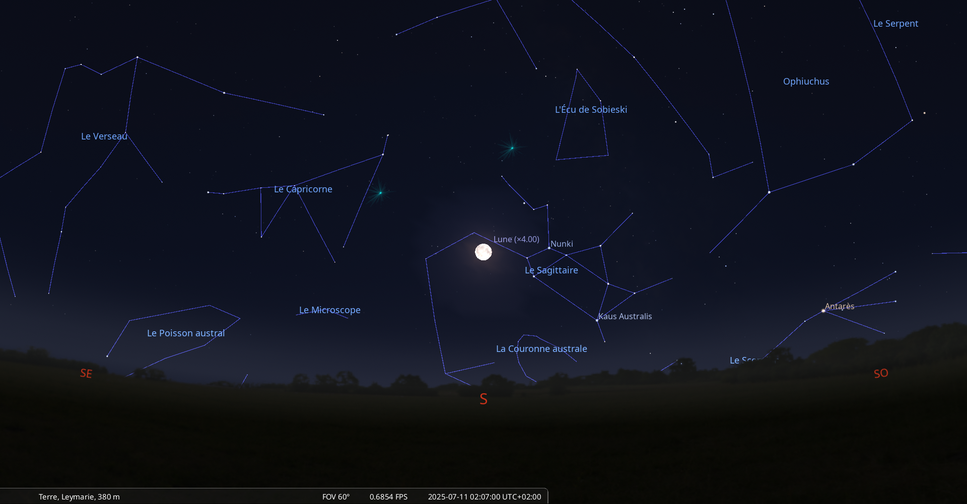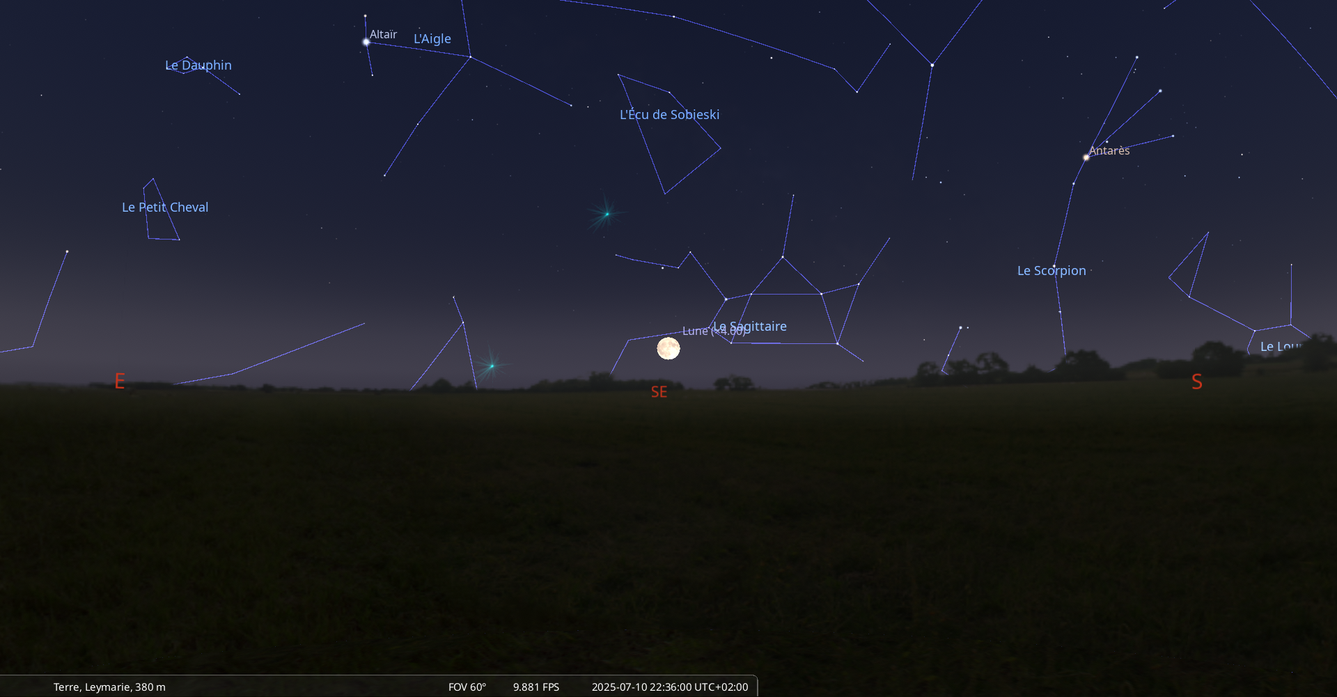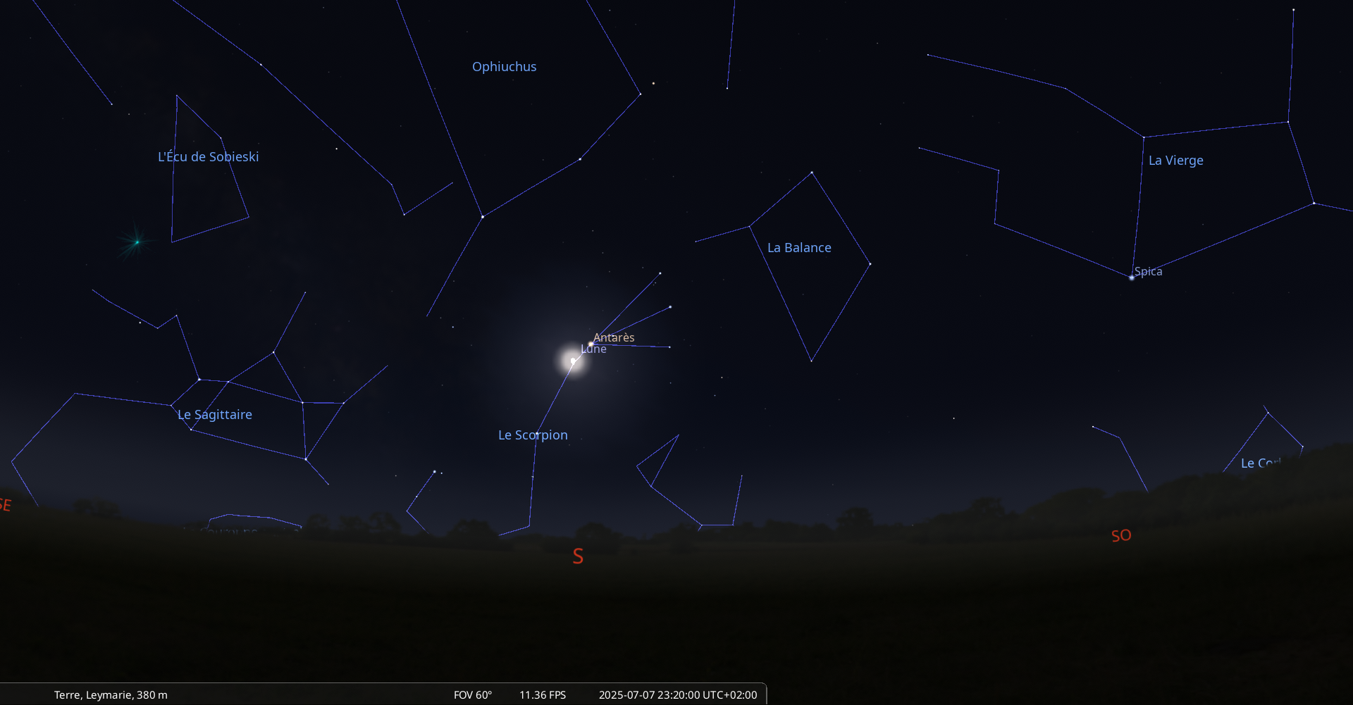 Ce soir, pour notre localisation, Antarès culmine à 23h18, la Lune à 23h25 ; Antarès se couche le 8 juillet à 3h23, la Lune à 3h29.