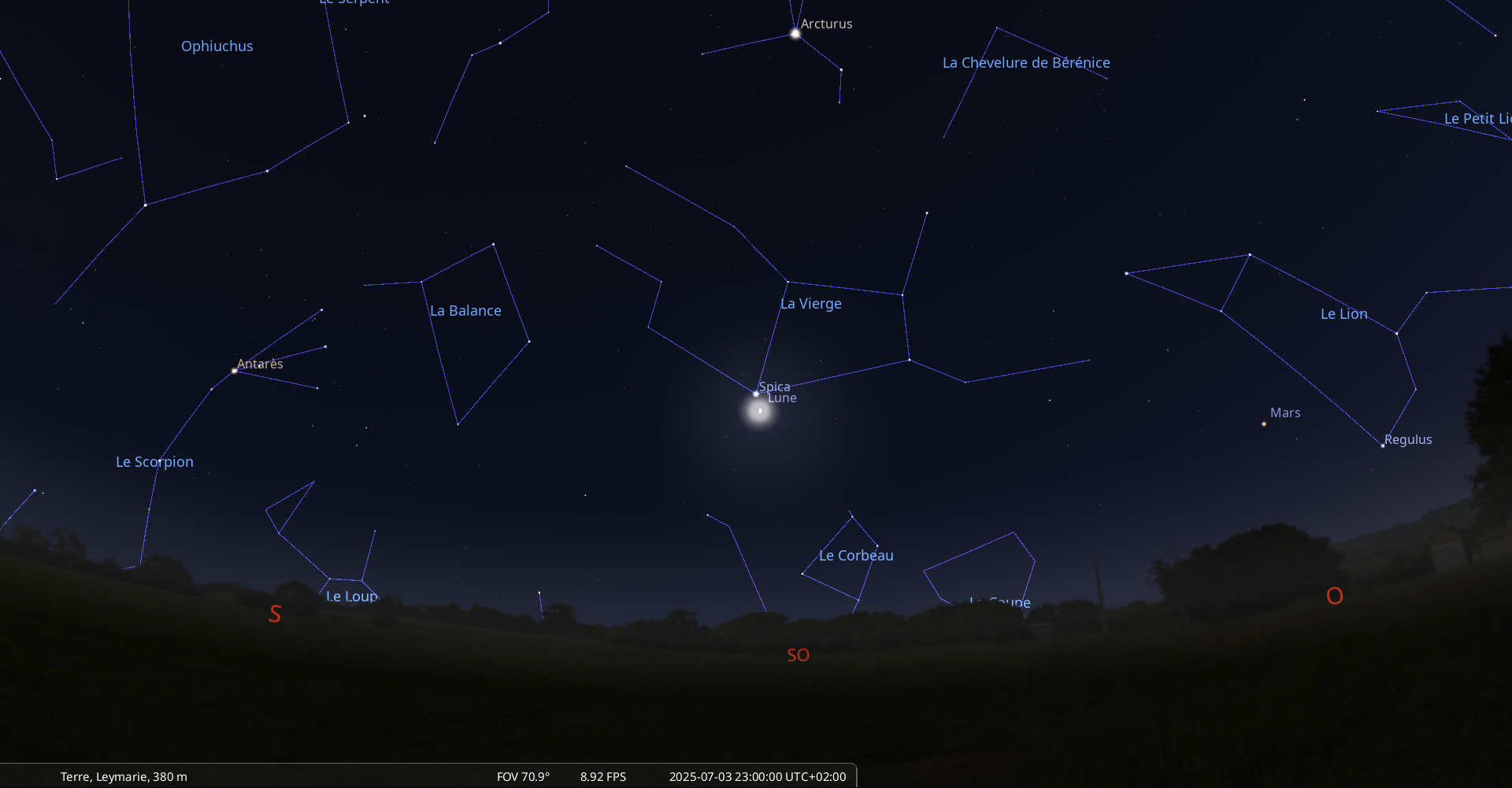 Aujourd’hui, pour notre localisation, la Lune culmine à 20h22 et Spica à 20h26 ;
