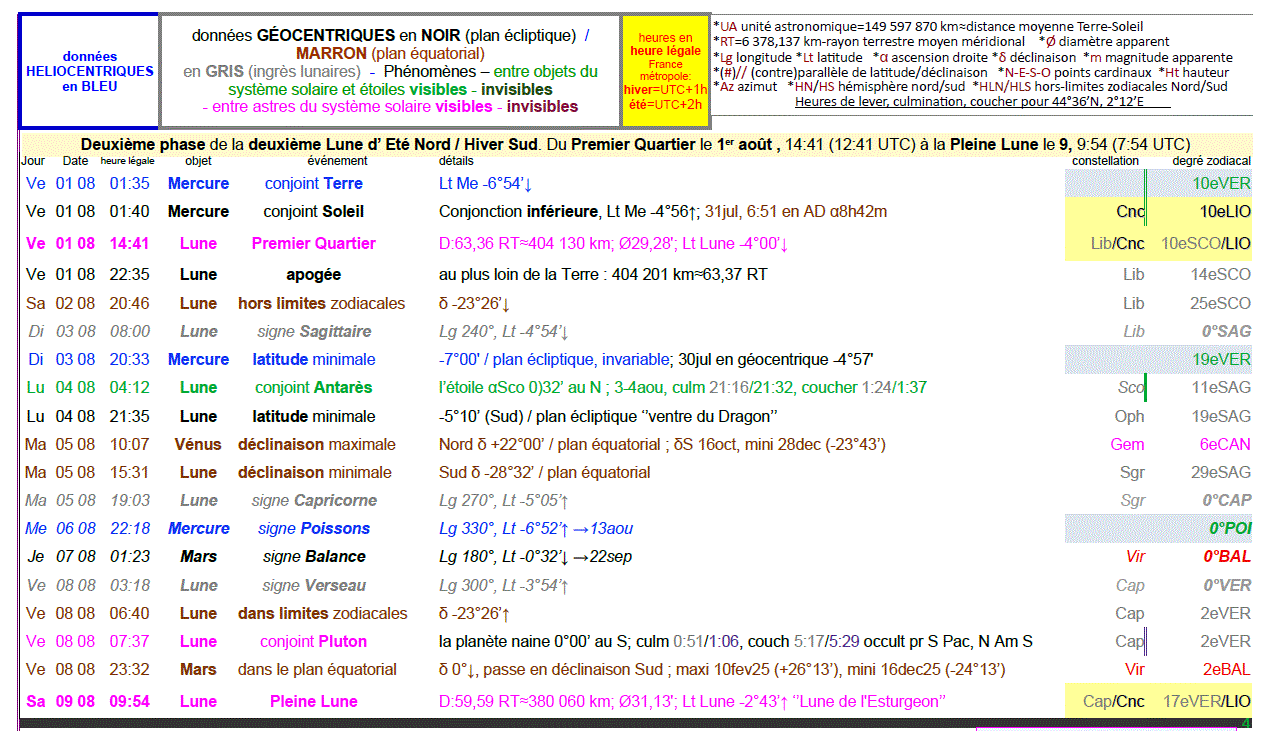 Le 3 août au soir, pour notre localisation, la Lune culmine à 21h16 et Antarès à 21h32 ; la Lune se couche le 4 août à 1h24 et Antarès à 1h37.