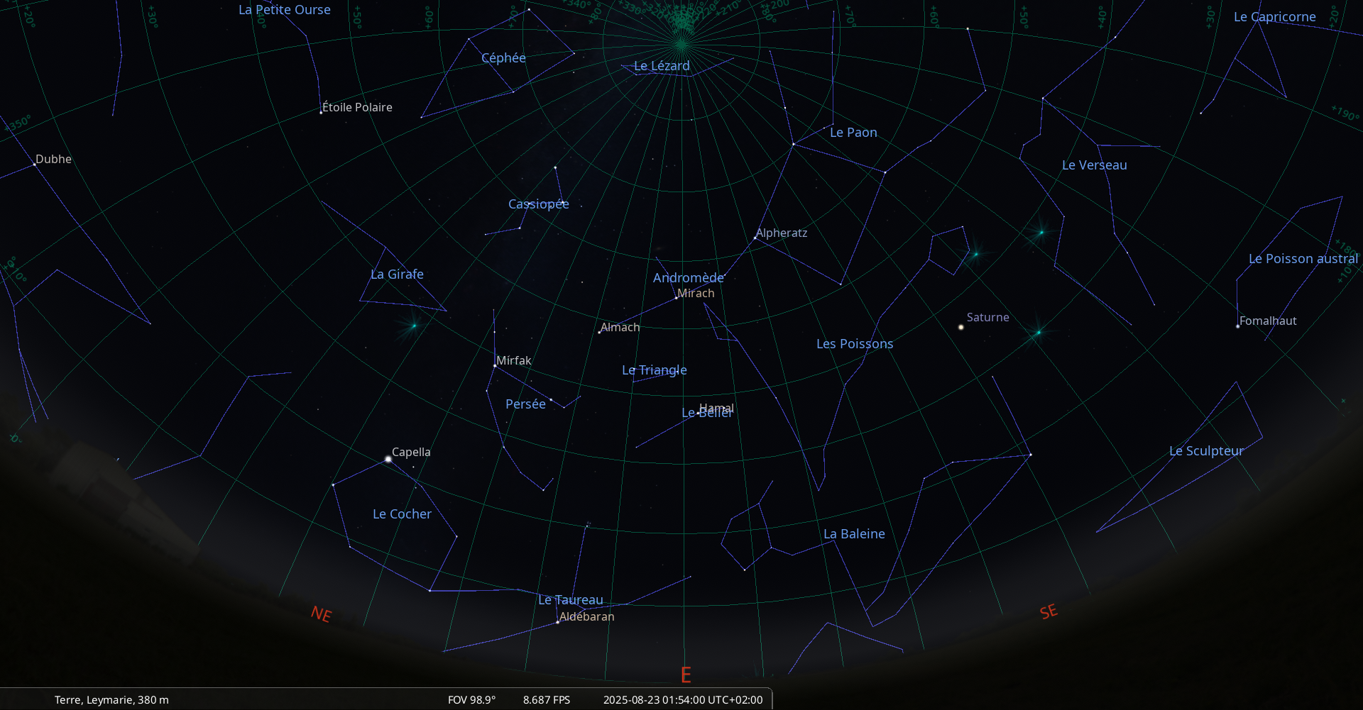 Dans la nuit du 16 au 17 août, pour notre localisation, Uranus (possible à voir aux jumelles) se lève à 0h37.