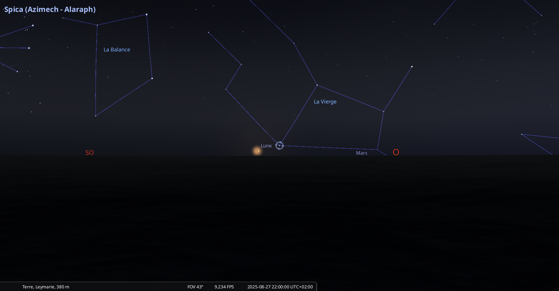 Ce soir, pour notre localisation, la Lune se couche à 22h03, Spica à 22h07.