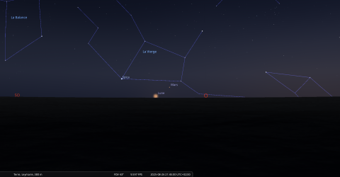 – A 4h51, la Lune arrive devant la constellation de la Vierge (Vir) ; longitude 174°08’ (25e VIE) ; latitude -0°32’, descend.