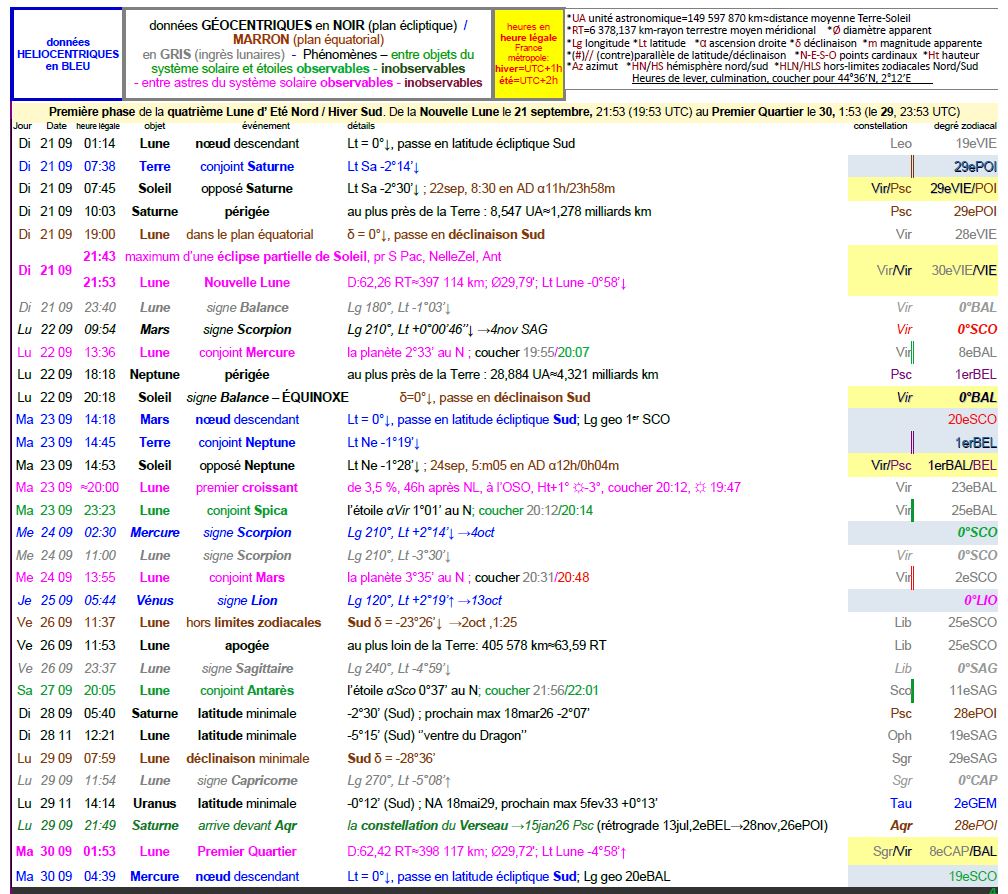 – A 23h40, la Lune entre dans le signe de la Balance ; Lg 180° à 210° ; sa latitude est alors de -1°03’, descend.
