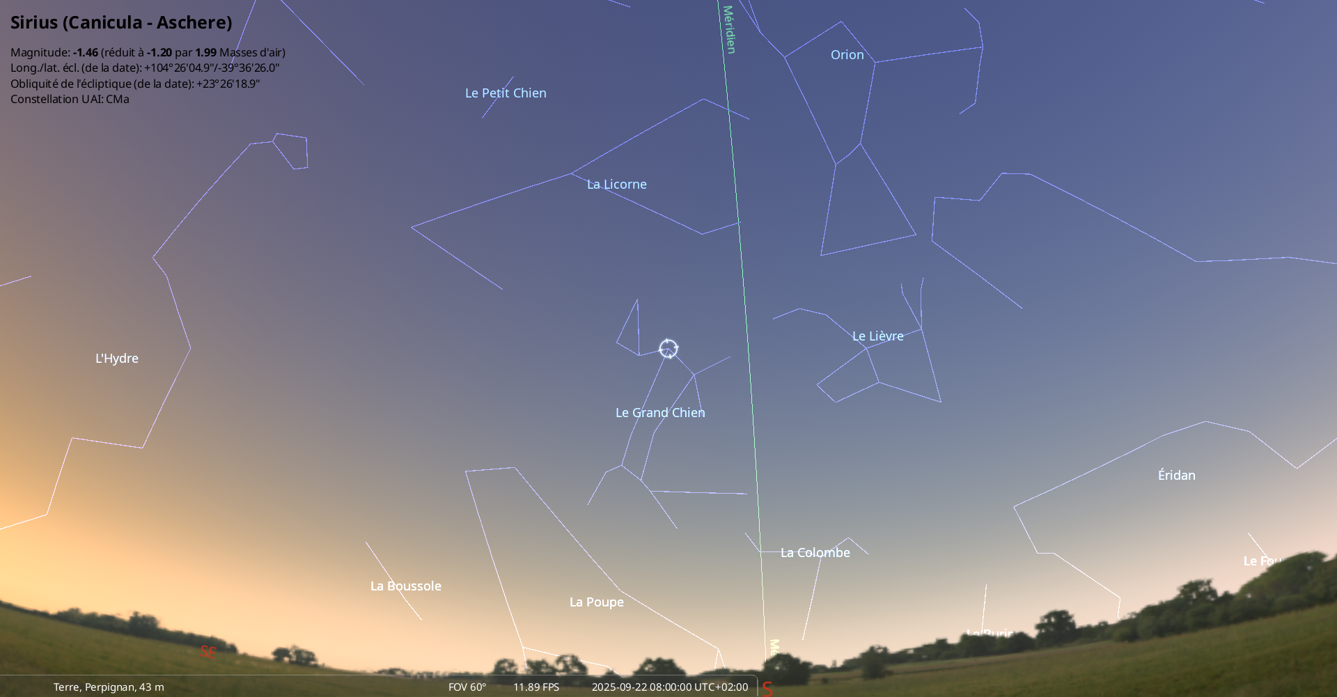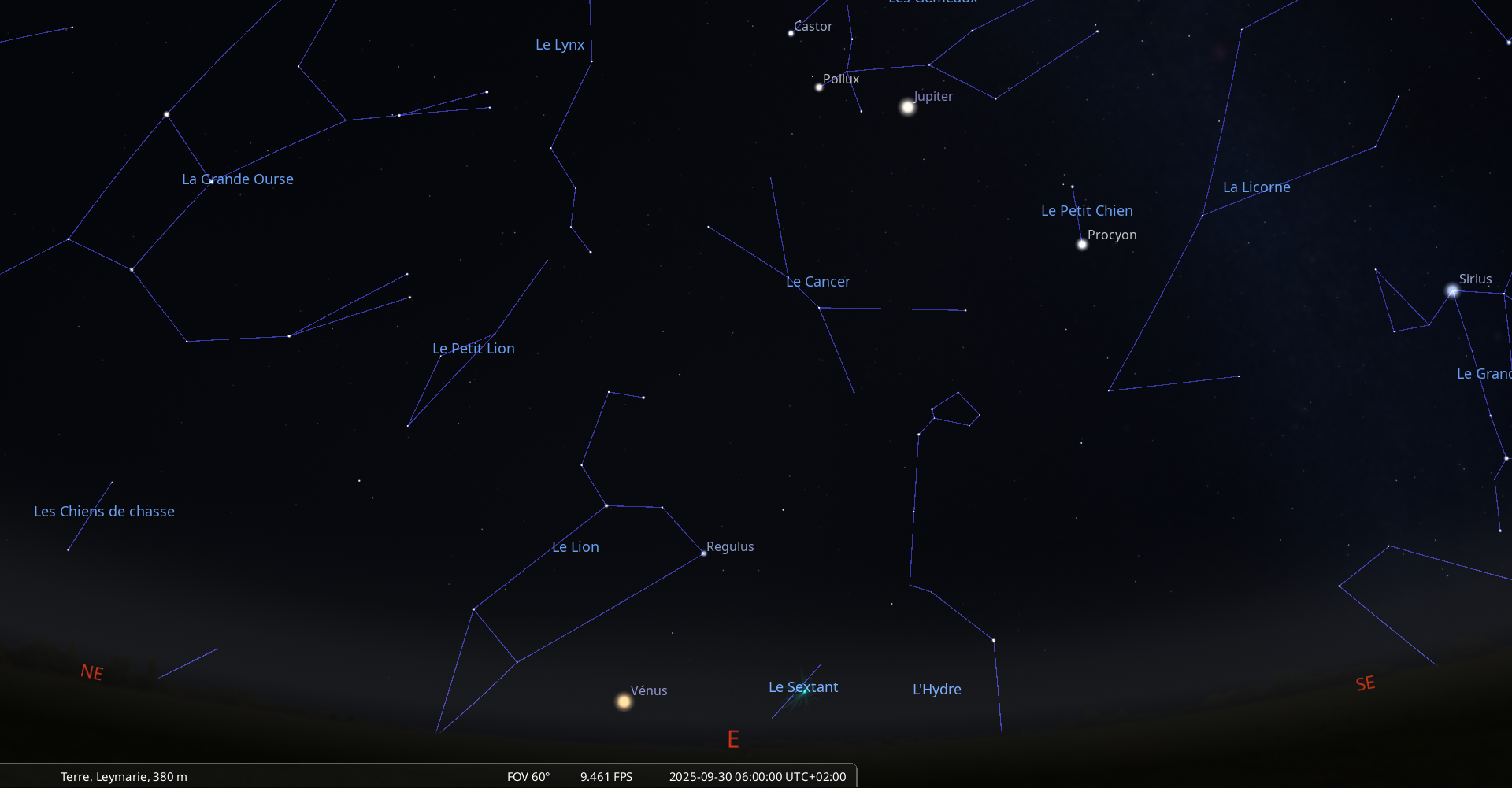 il se trouve au raz de l’horizon, à 1° de hauteur pour notre localisation, à l’Ouest-sud-ouest (azimut 249°) ;