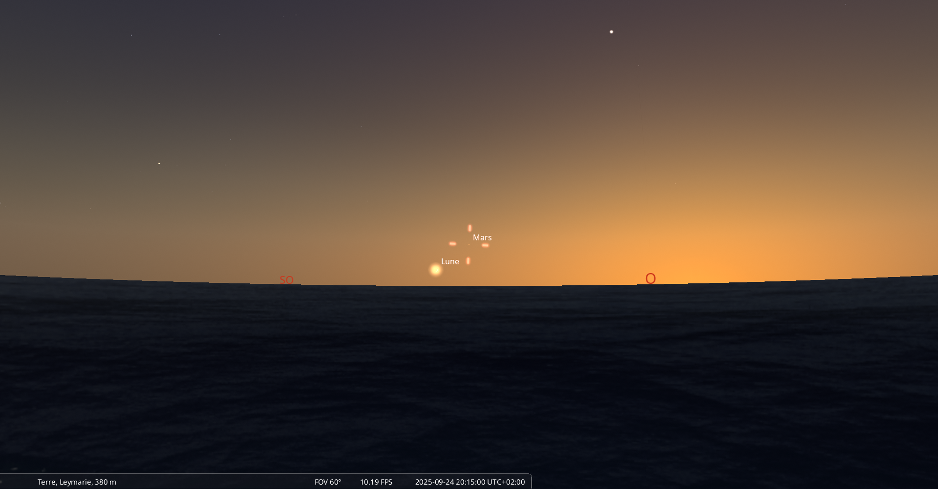 Ce soir, pour notre localisation, la Lune se couche à 20h31, Mars à 20h48.