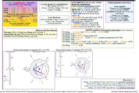 - A 5h43, la Lune arrive devant la constellation de la Balance (Lib) ; longitude 219°18’ (10e Sco) ; latitude -4°05’, descend.