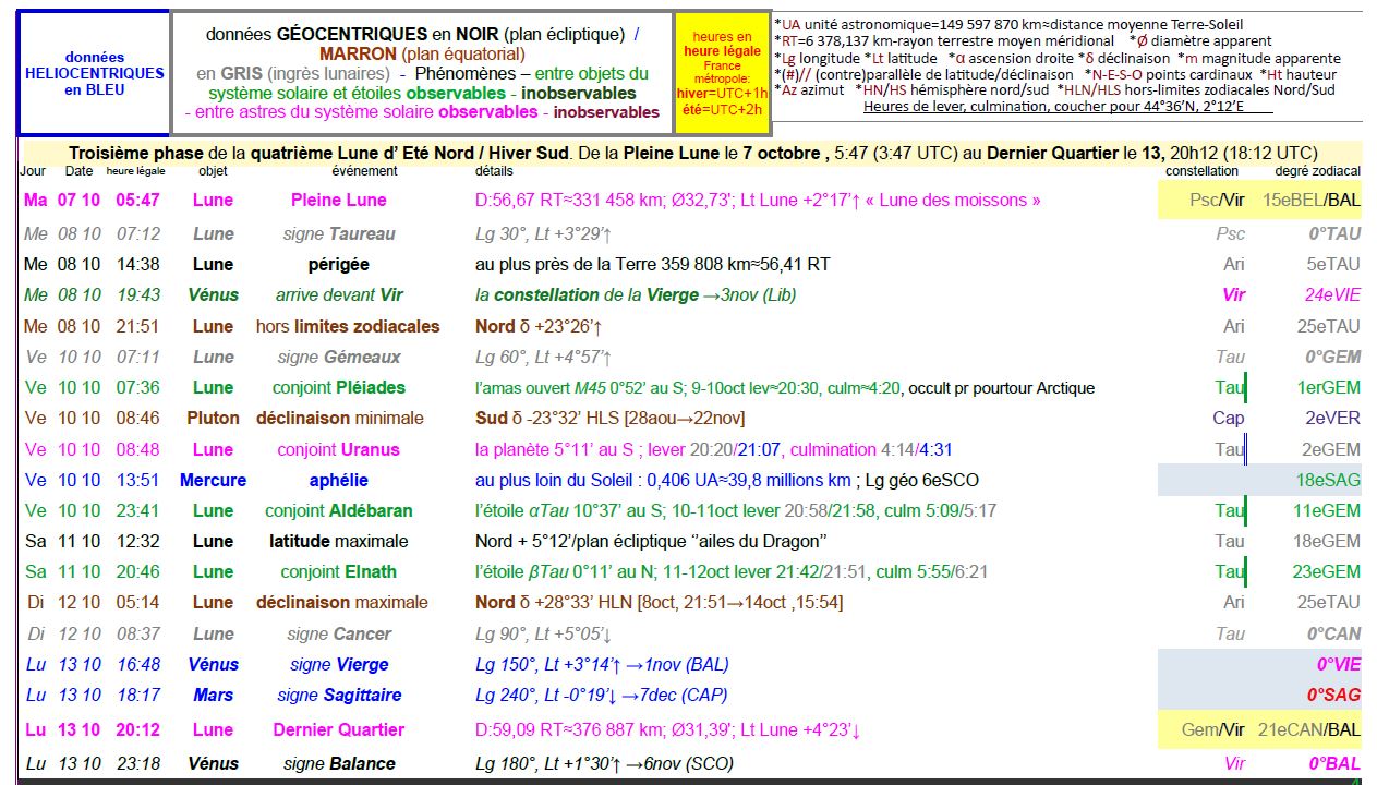 – A 7h12, la Lune entre dans le signe du Taureau ; Lg 30° à 60° ; sa latitude est alors de +3°29’, monte.