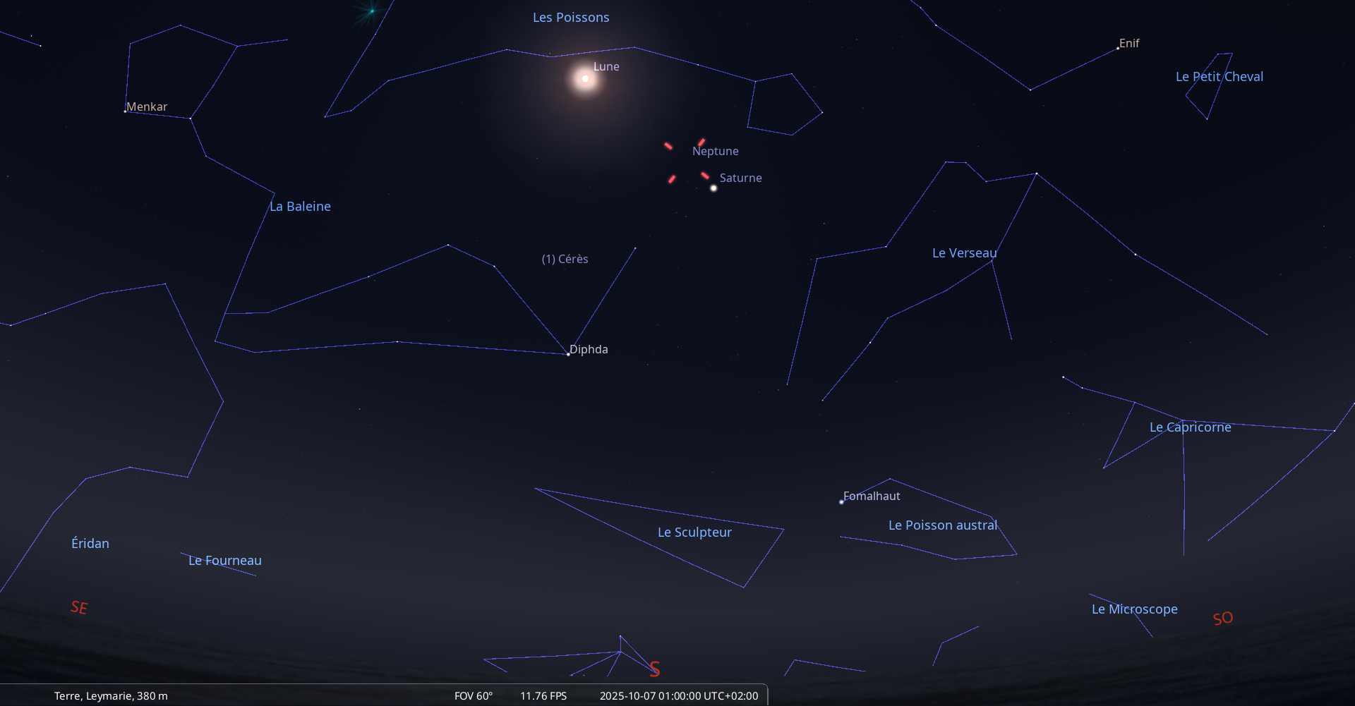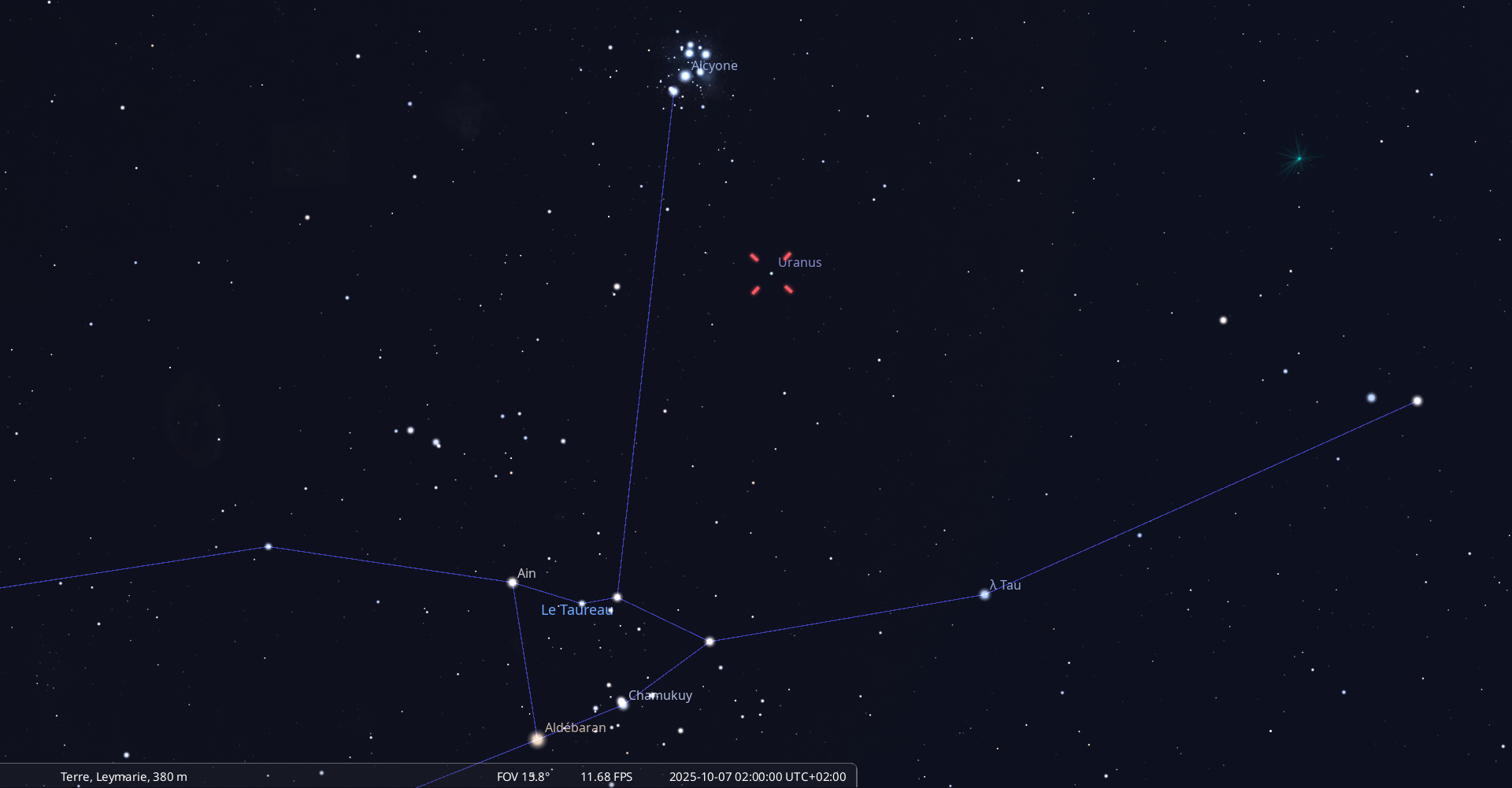 Dans la nuit du 9 au 10 octobre, pour notre localisation, Uranus (possible à voir aux jumelles sous les Pléiades)