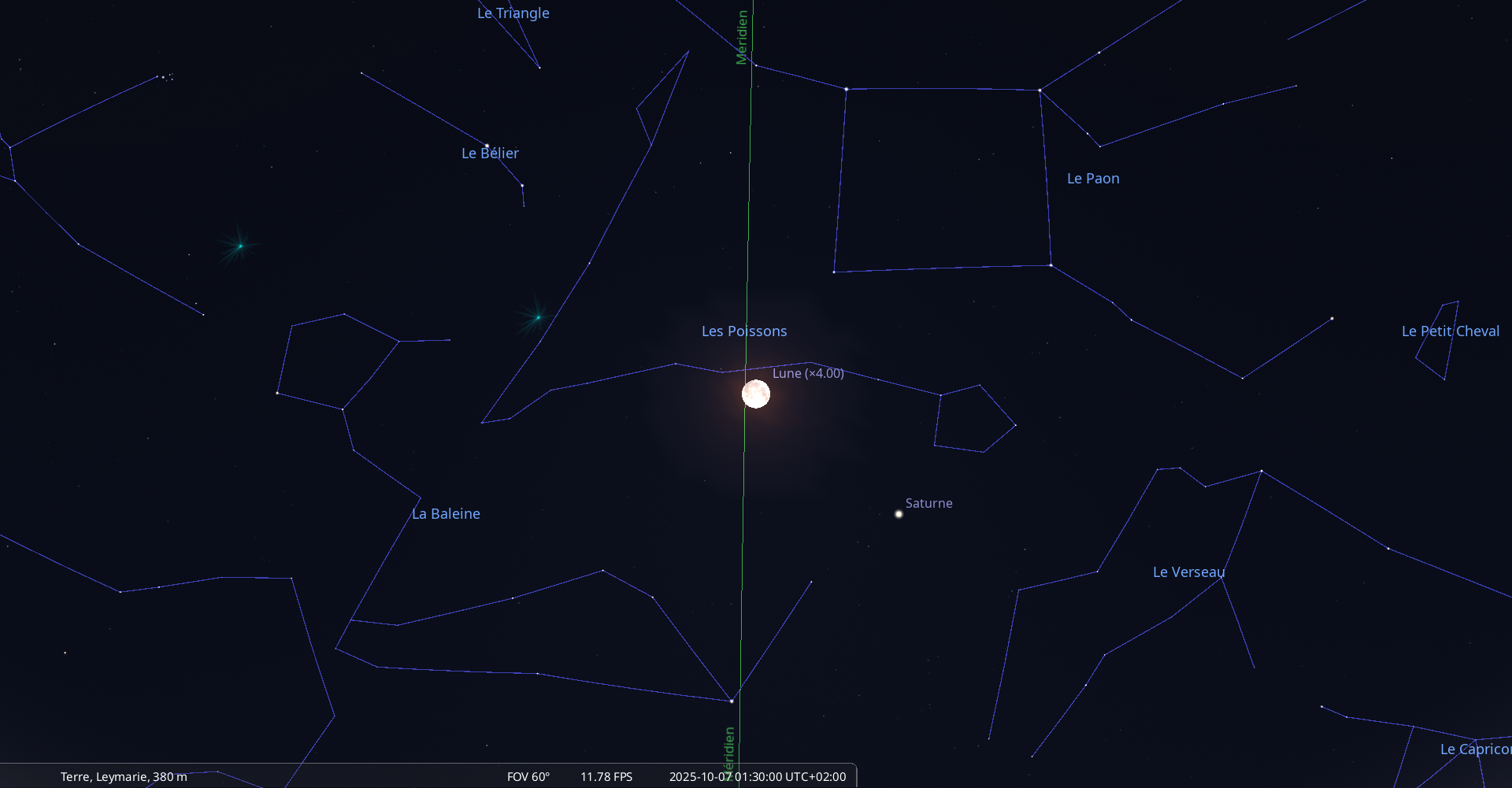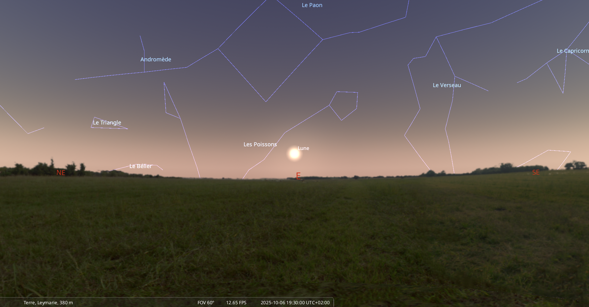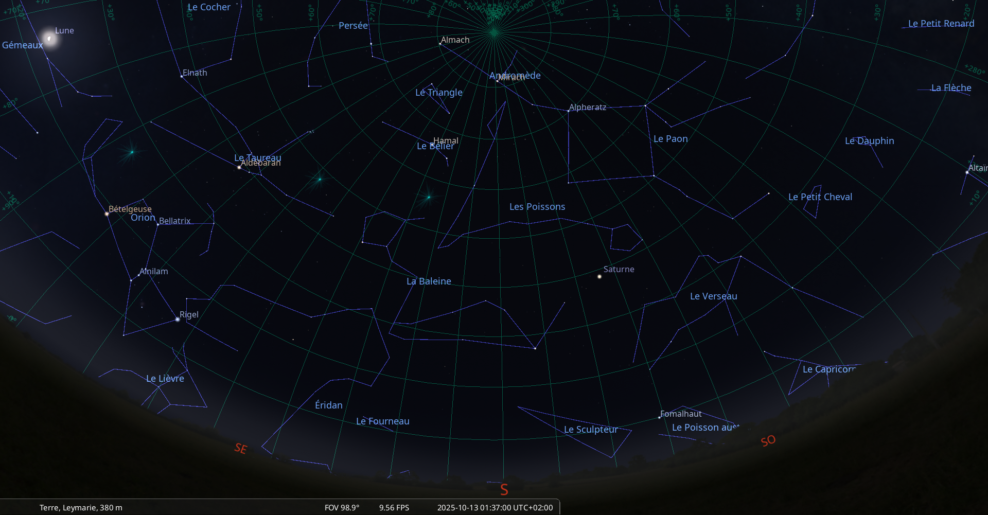 – A 9h06, la Lune arrive devant la constellation du Bélier (Ari) ; longitude 31°11’ (2e TAU) ; latitude +3°33’, monte.