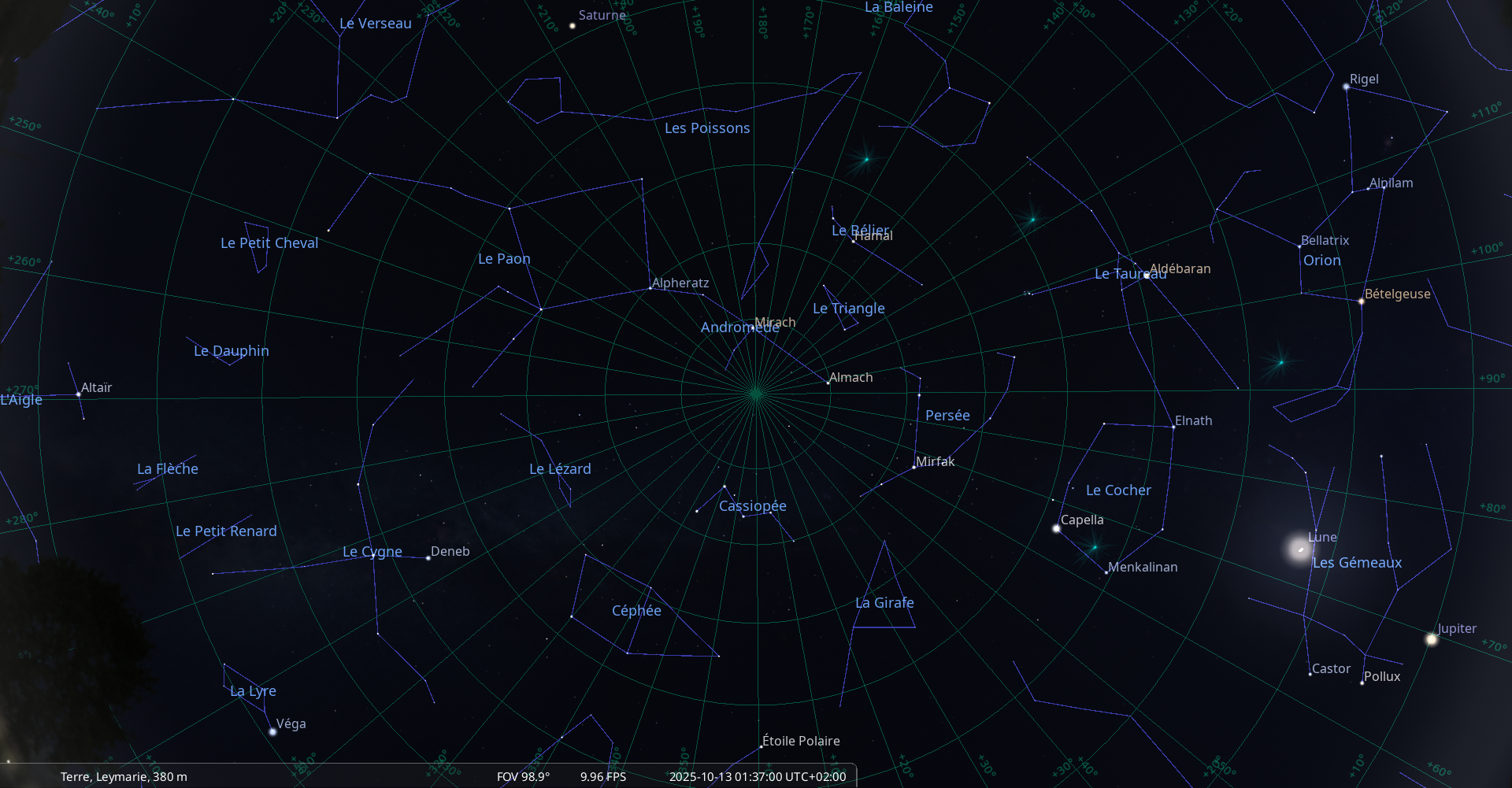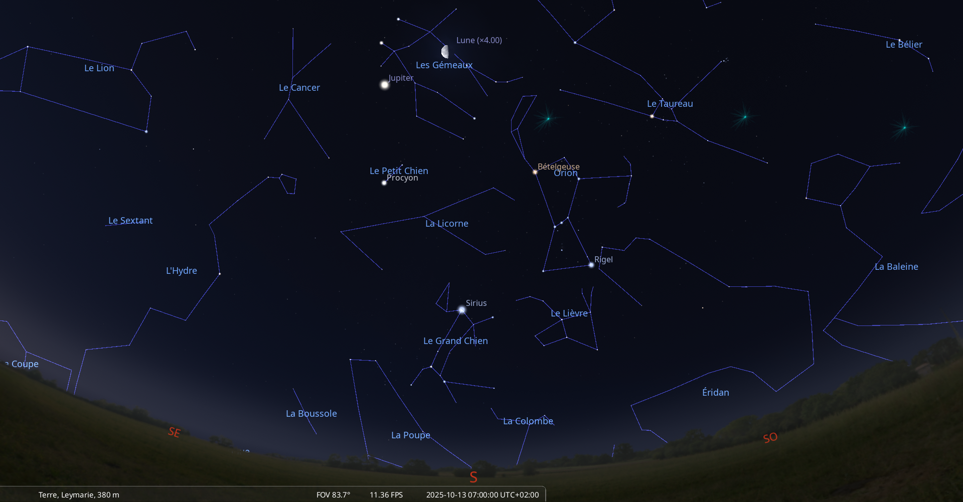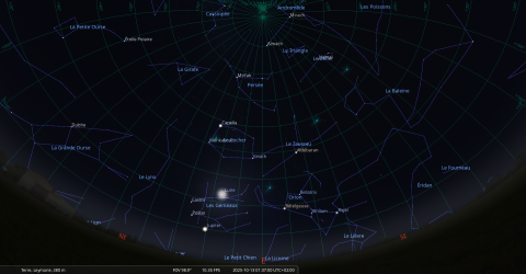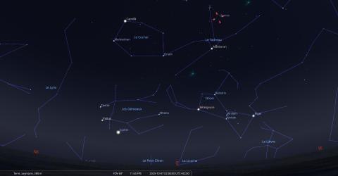 – A 10h36, la Lune arrive devant la constellation du Cocher (Aur) ; longitude 91°10’ (2e CAN) ; latitude +5°04’, descend.