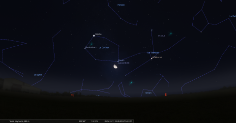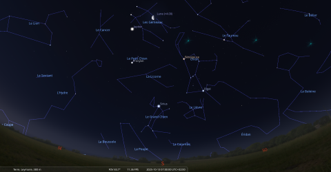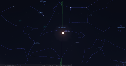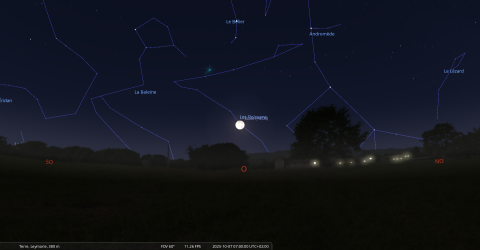Dans la nuit du 10 au 11 octobre, pour notre localisation, la Lune se lève à 20h58 et Aldébaran, une heure plus tard, à 21h58.