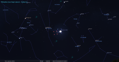 Dans la nuit du 9 au 10 octobre, pour notre localisation, la Lune se lève à 20h20 et les Pléiades à 20h40, en compagnie d’Uranus.