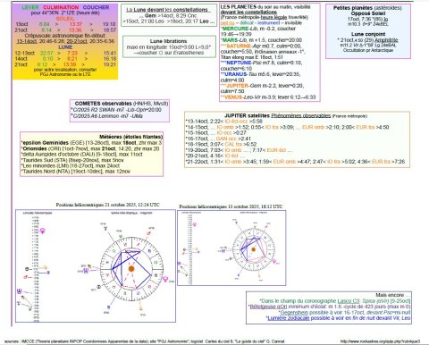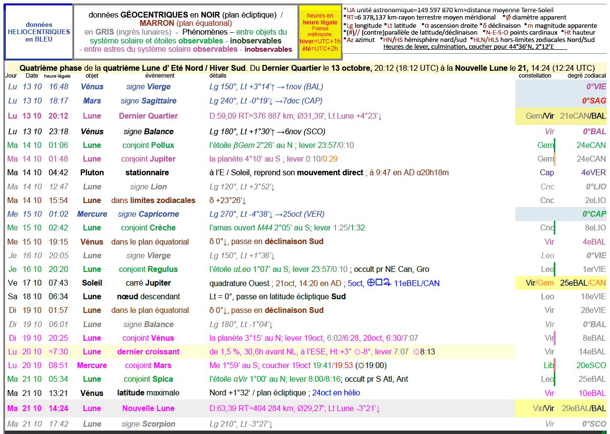 - A 20h25, la Lune est conjointe à Vénus dans le plan écliptique, la planète 3°15’ au Nord ; longitude 187°18’ (8e BAL).