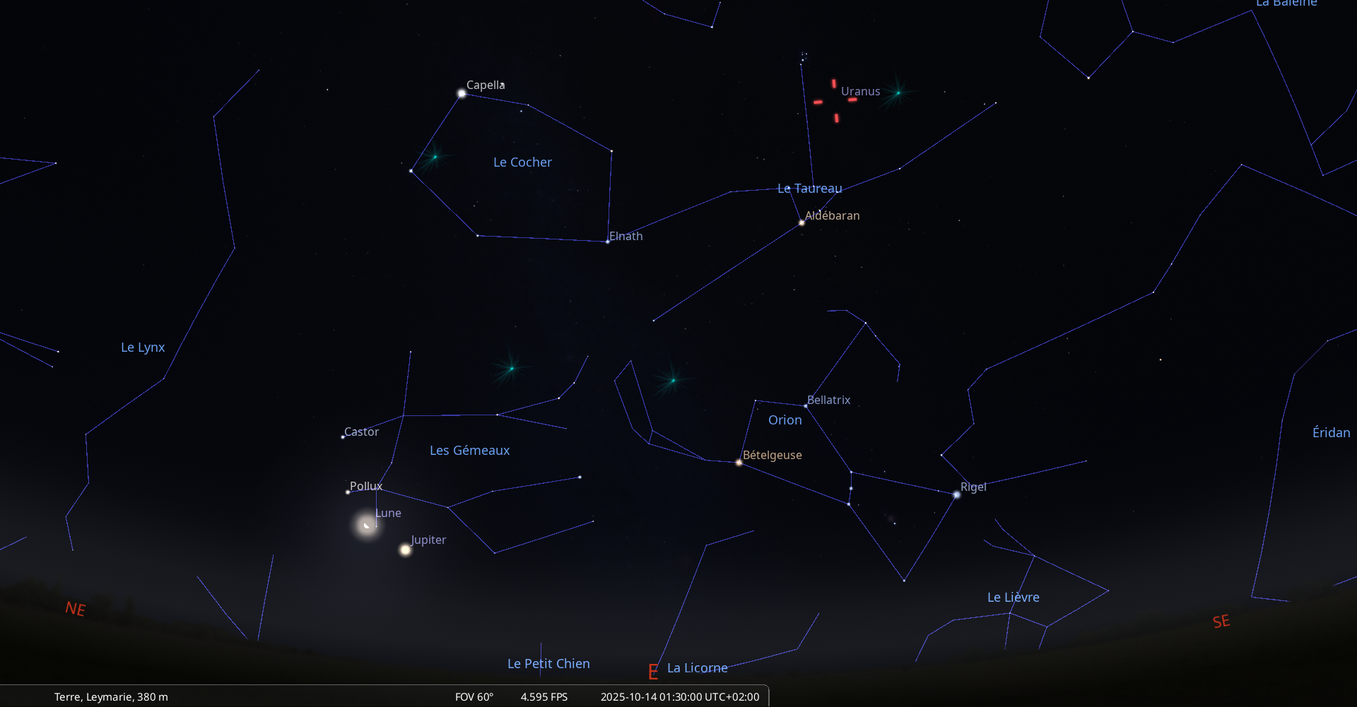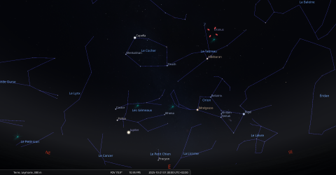 Cette nuit, Pollux se lève à 23h57 et la Lune à 0h10 pour notre localisation.