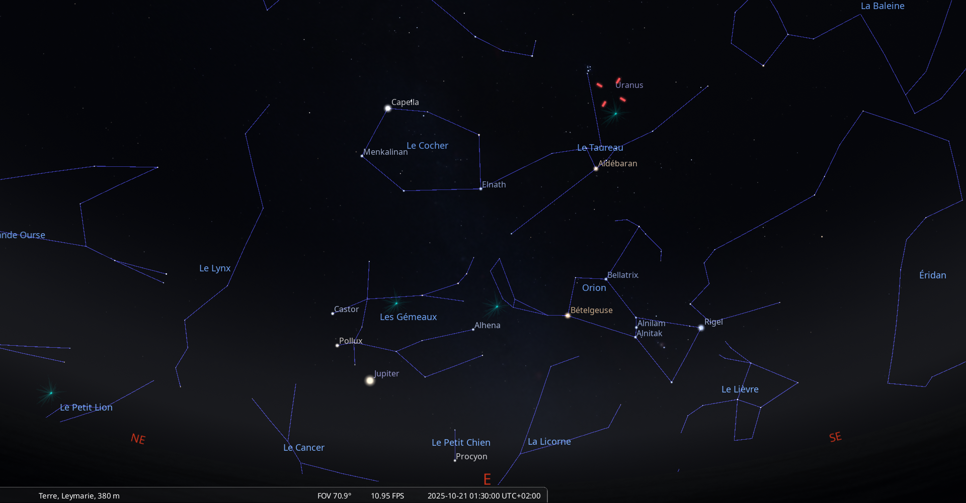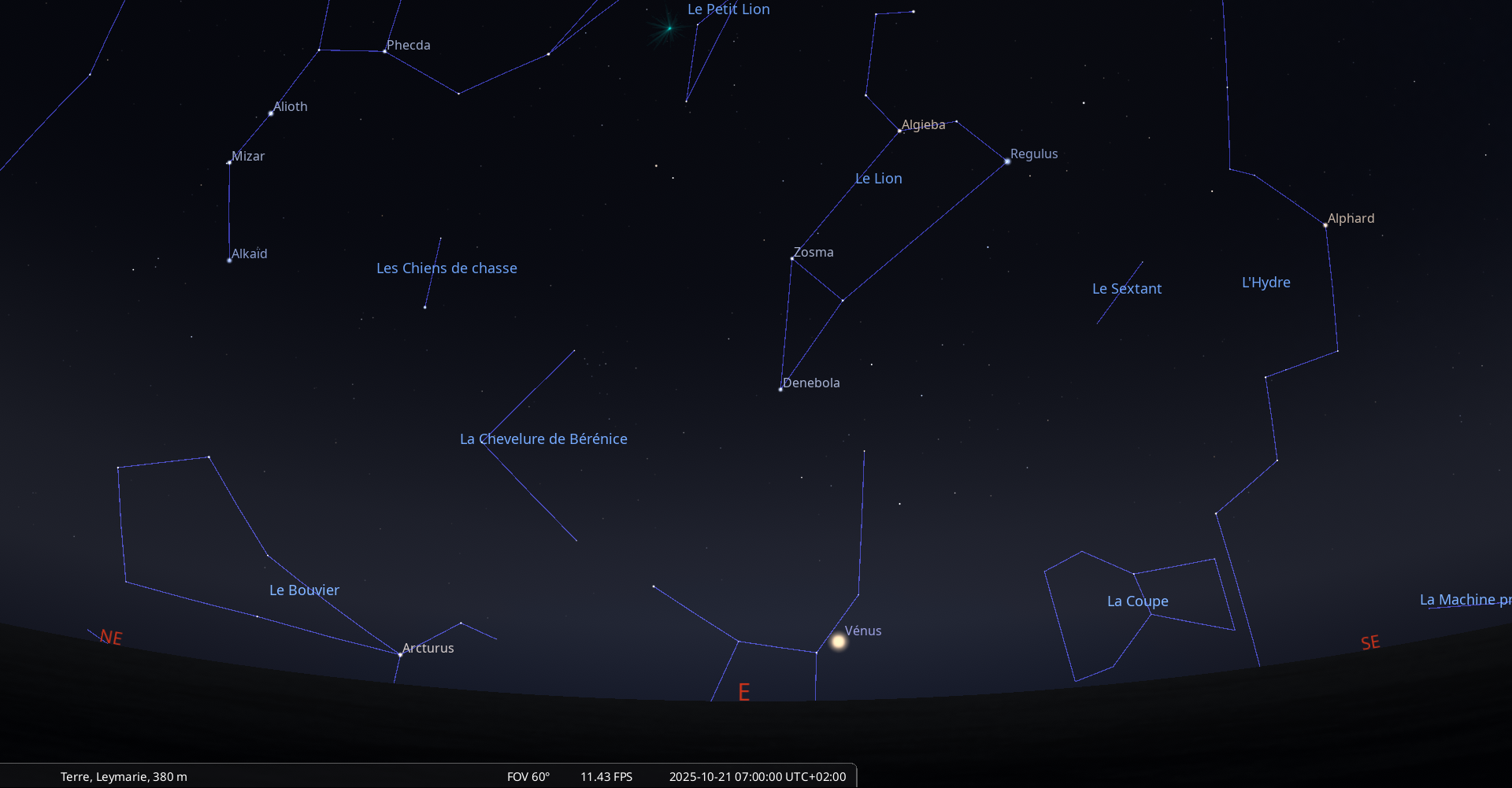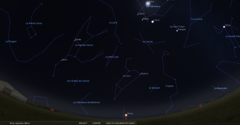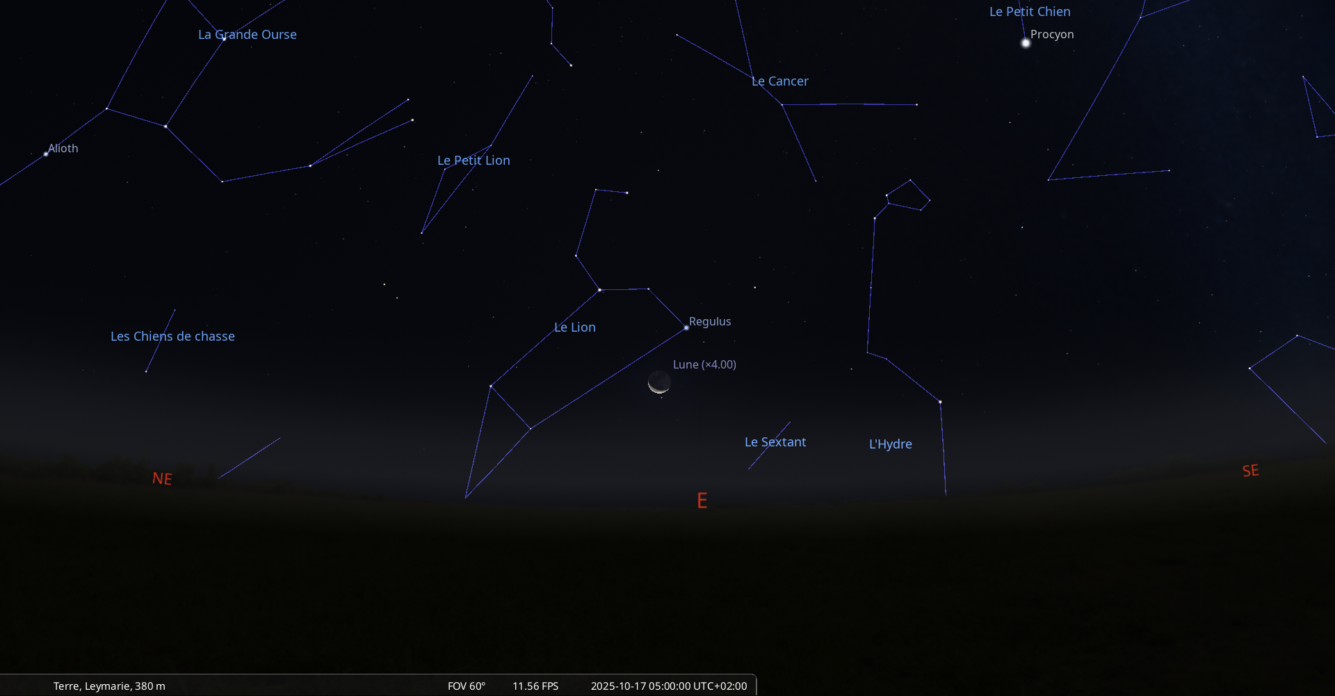 Aujourd’hui, pour notre localisation, la Lune se lève à 2h39 et Régulus à 3h31.