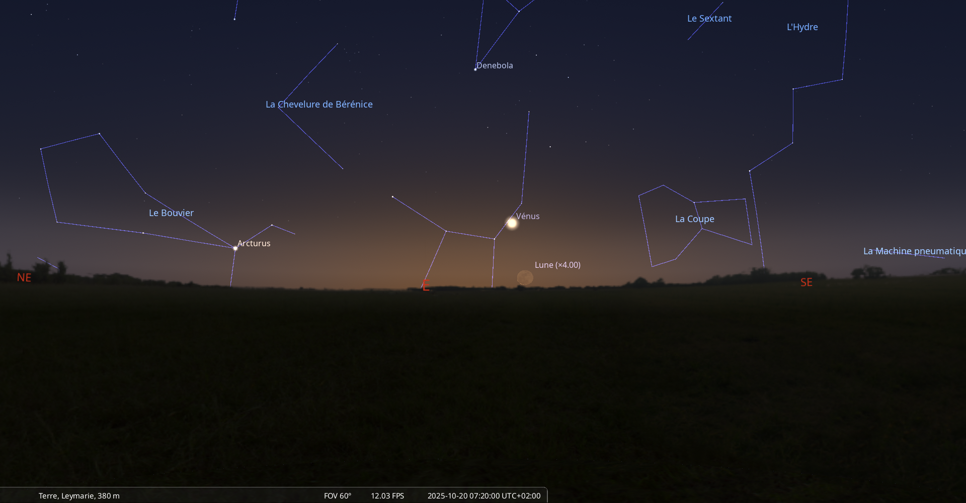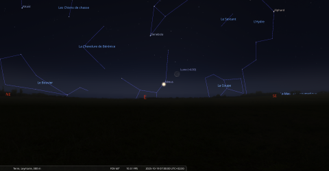 Au petit matin de ce jour, pour notre localisation, la Lune se lève à 6h02 et Vénus à 6h28.