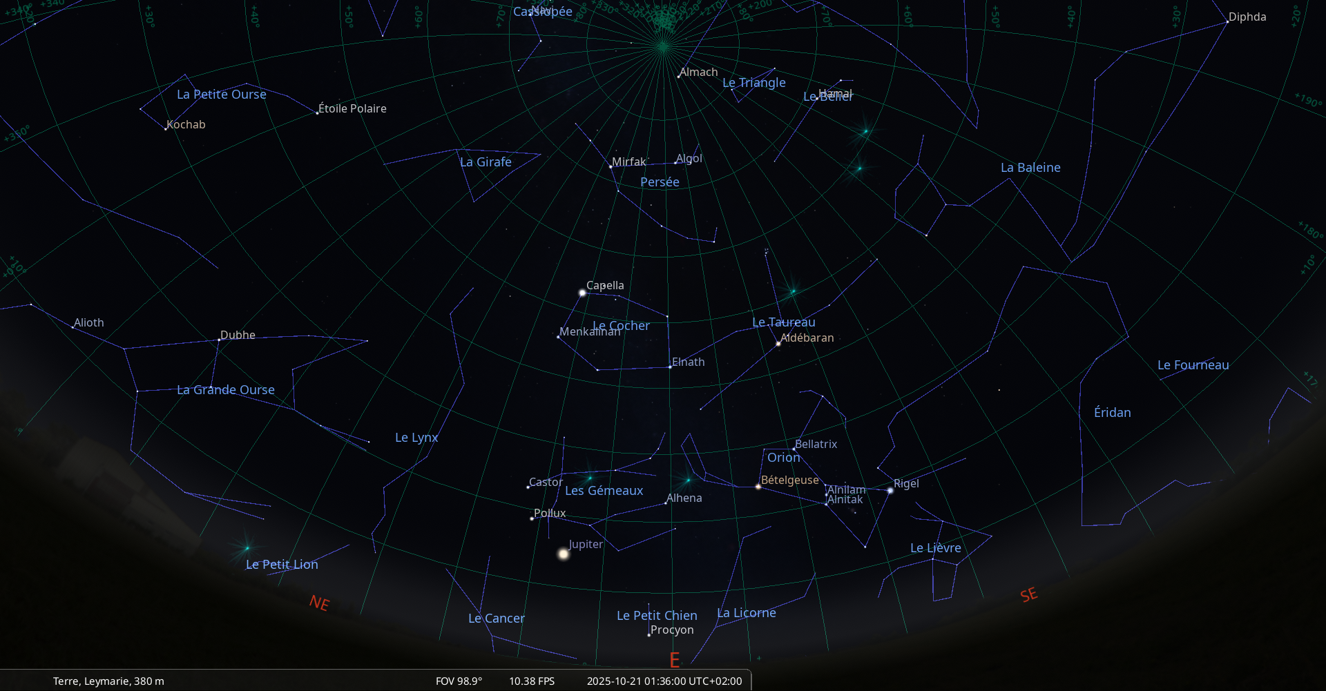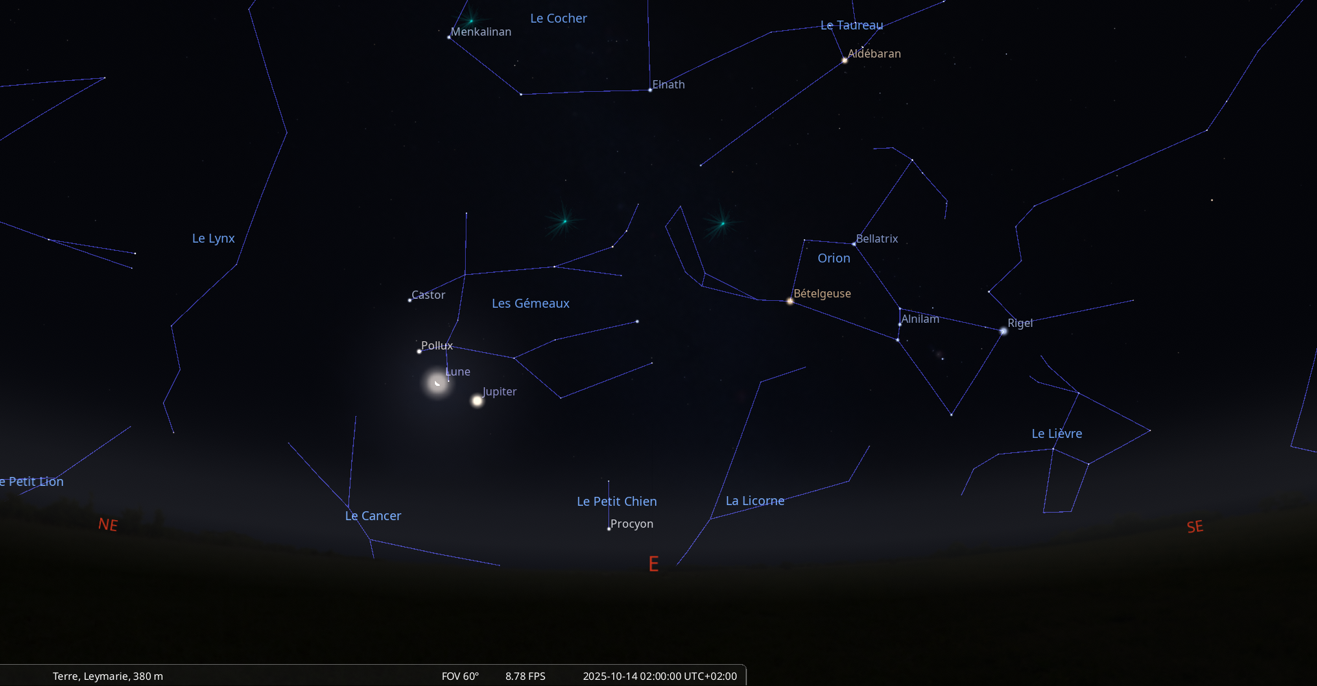 Cette nuit, pour notre localisation, la Lune se lève à 0h10 et Jupiter à 0h29.