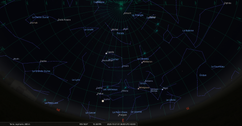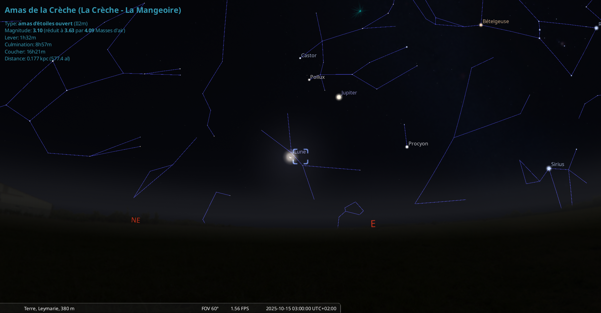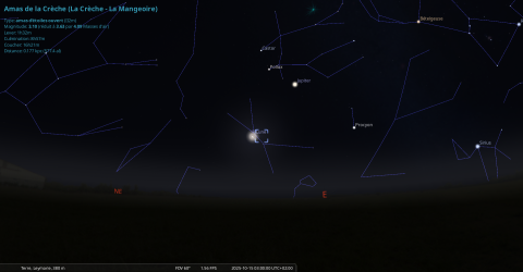 Cette nuit, pour notre localisation, la Lune se lève à 1h25 et la Crèche à 1h32.