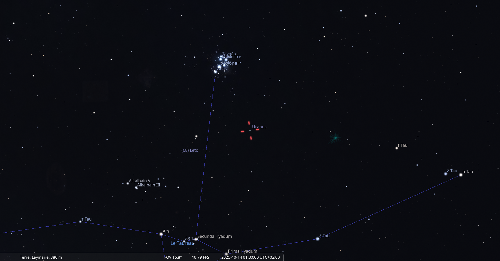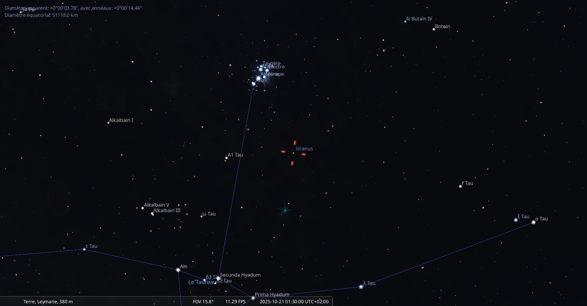 Son élongation est de 13° Ouest ; il est devant la constellation de la Vierge (Vir) et marque le 14e degré du signe de la Balance.
