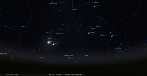 – Aux alentours de 5h00, la Lune s’aligne avec Castor et Pollux, sous l’oeil de Jupiter.