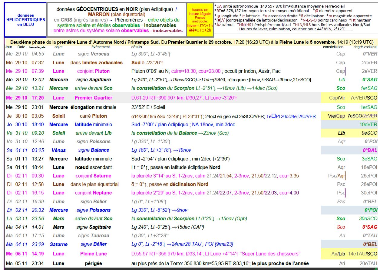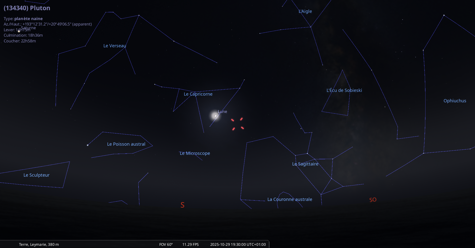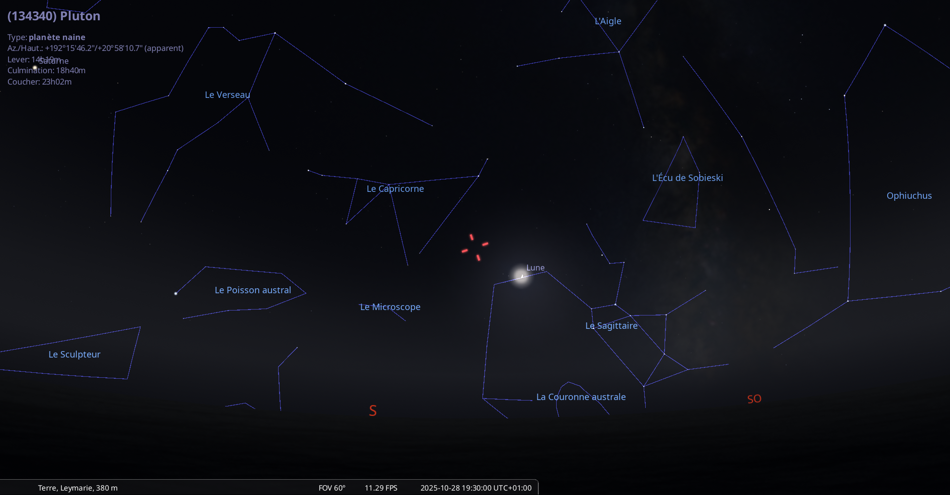 Le 28 octobre au soir, pour notre localisation, la Lune culmine à 18h11 et l’invisible Pluton à 23h02.