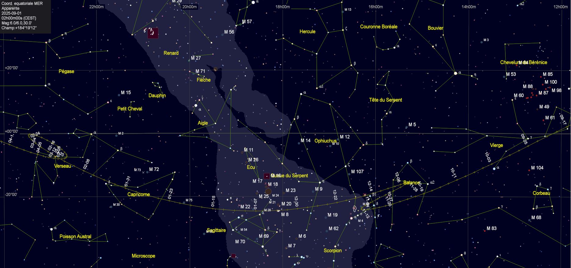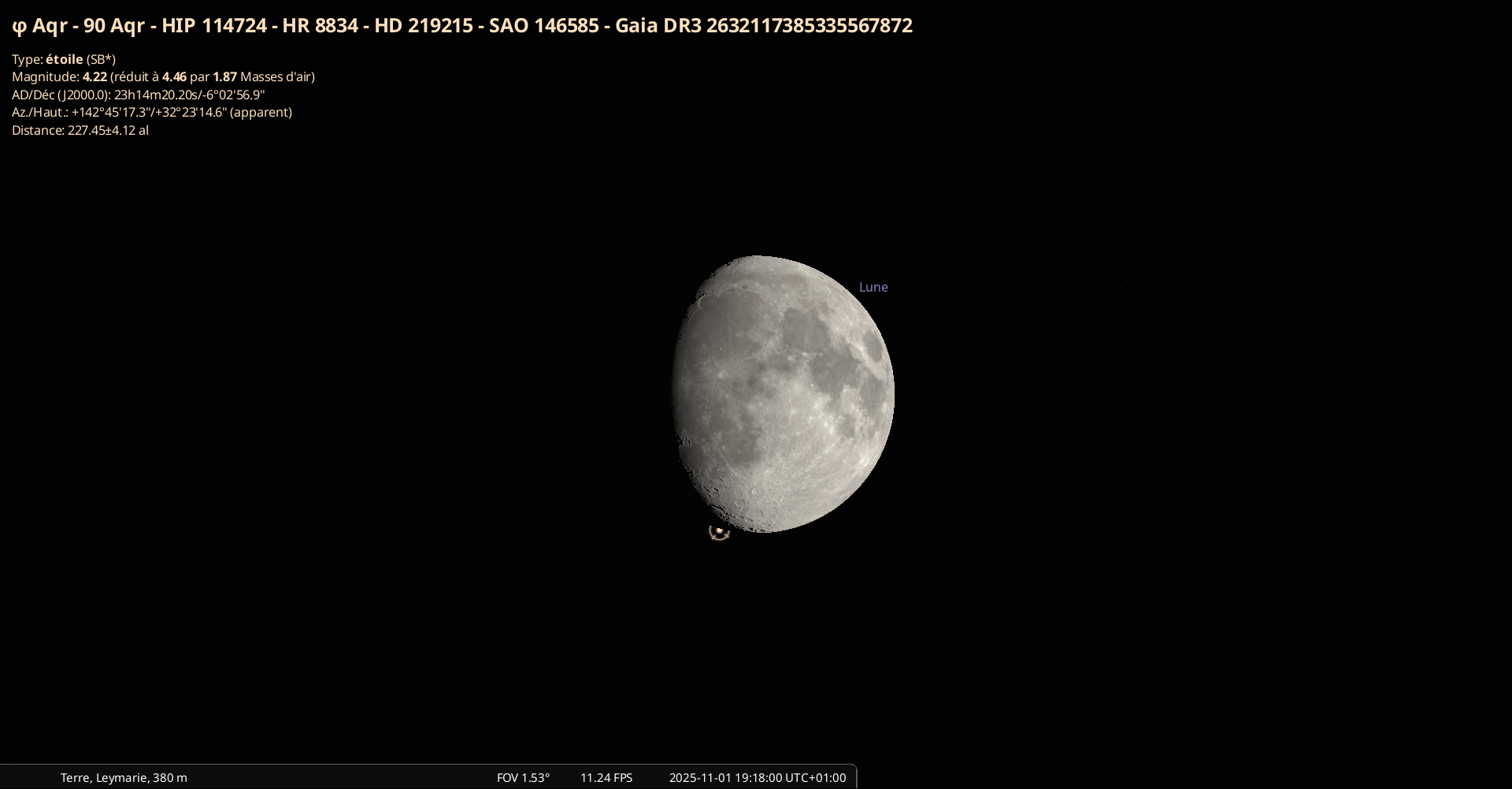 - Aux alentours de 19h18 pour notre localisation, l’étoile phi Aqr, alias 90 Aqr (Verseau, magnitude 4.2)