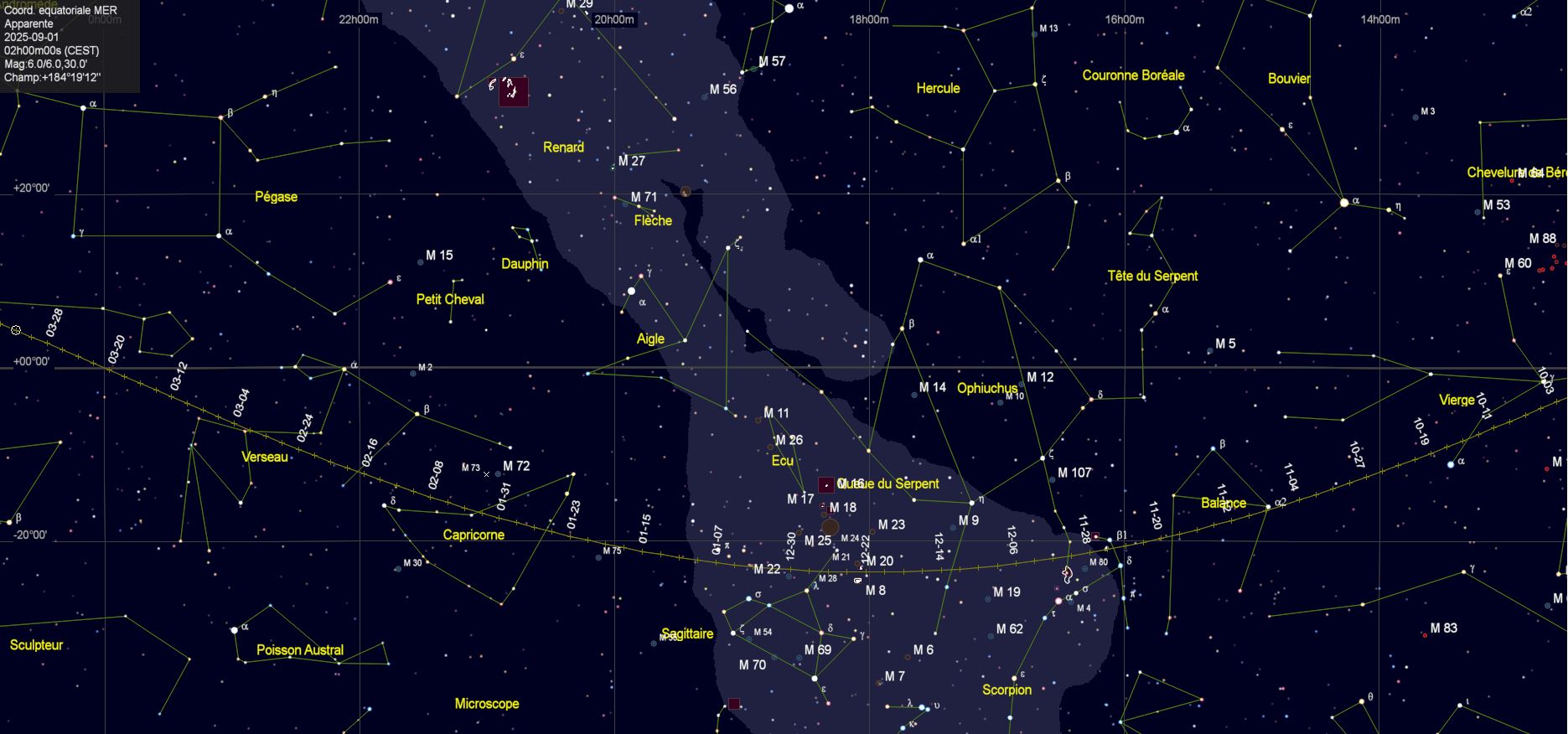 - A 7h32, la Lune rentre dans les limites zodiacales Sud (-23°26’18") ; ascension droite 20h 17m ;