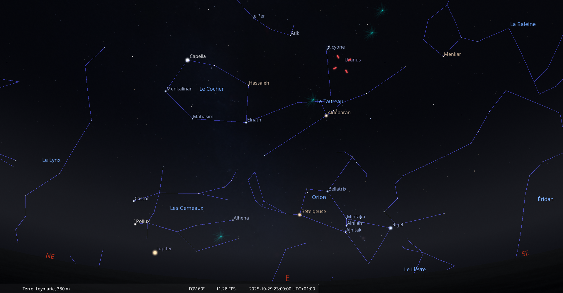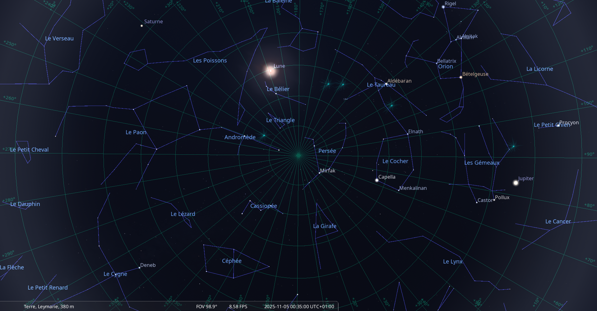 – A 16h40, la Lune arrive devant la constellation du Bélier (Ari) ; longitude 352°34’ (23e POI) ; latitude +3°27, monte