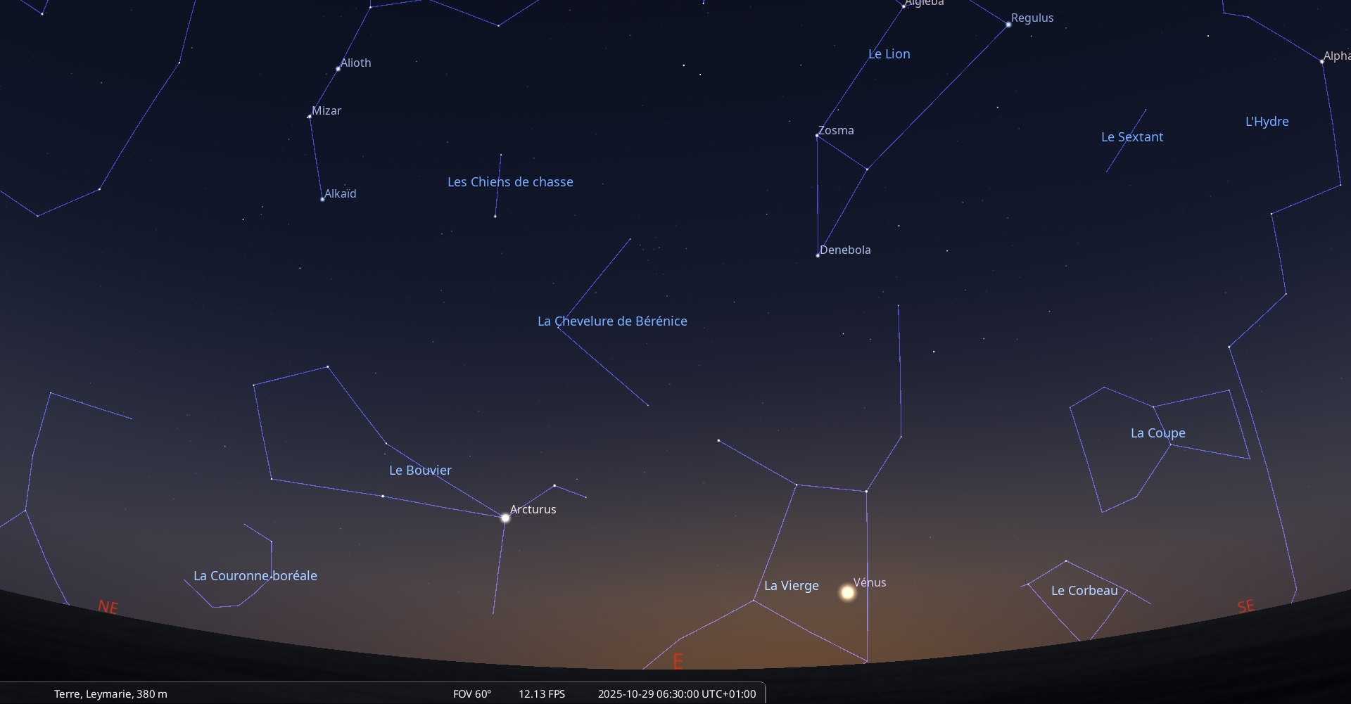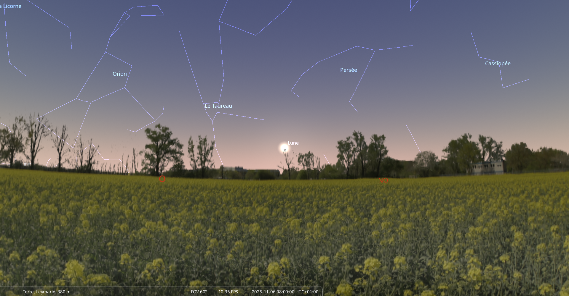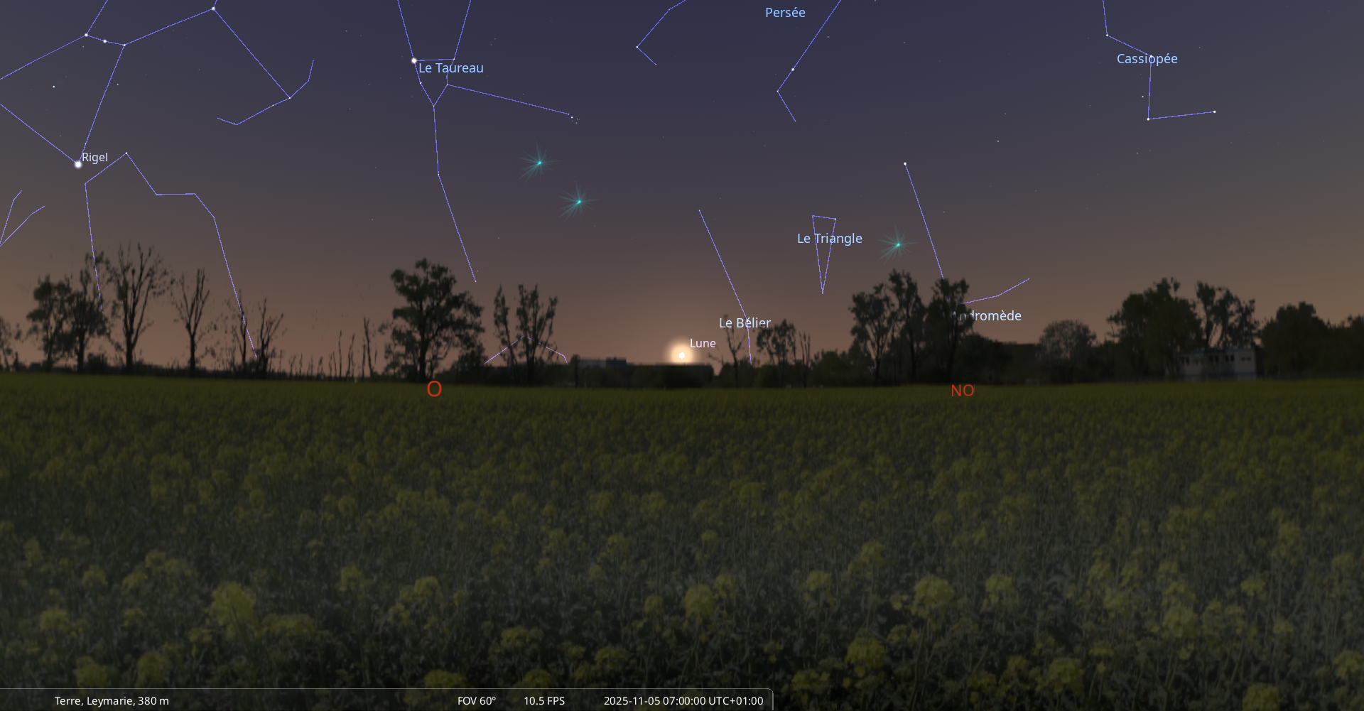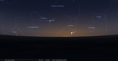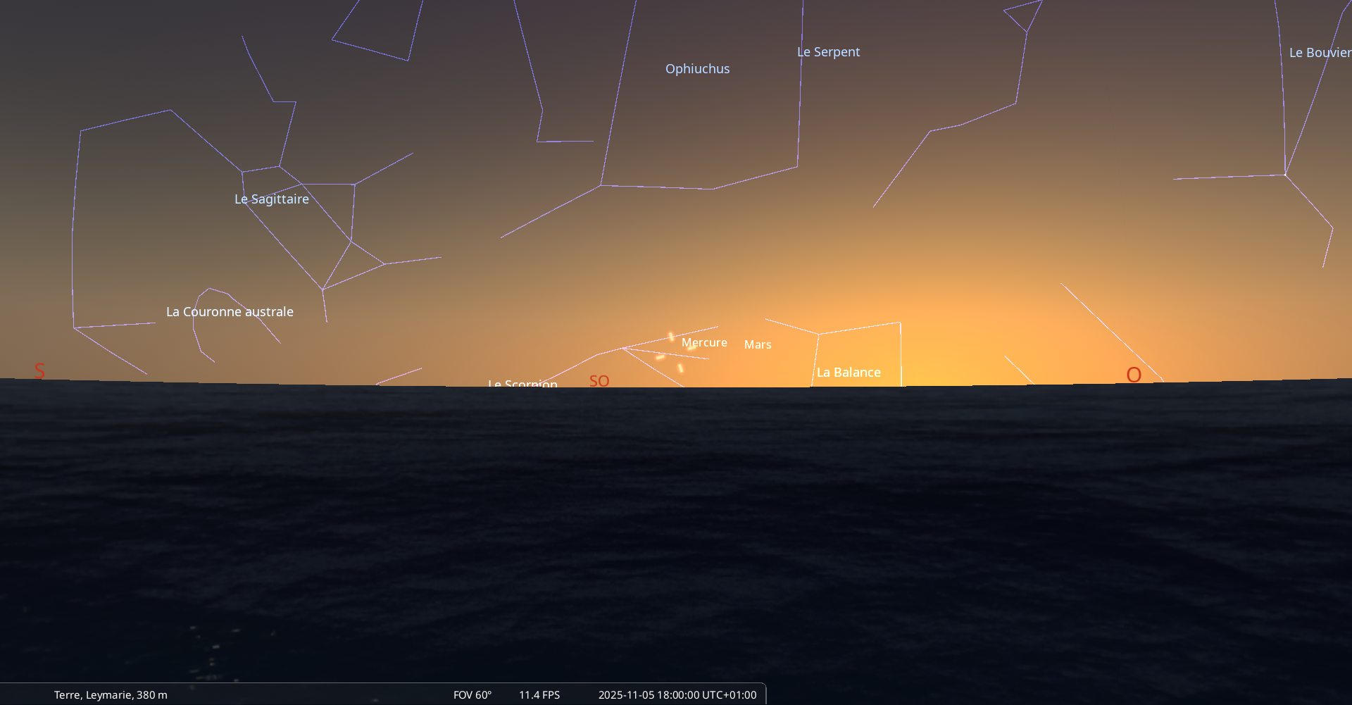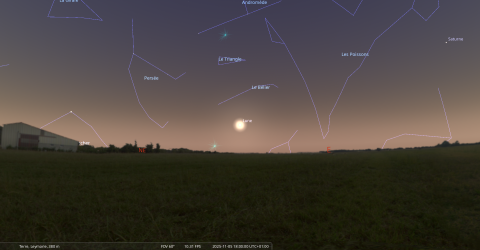 Elle se couche le 5 novembre à l’ouest-nord-ouest à 7h28 soit 6 minutes avant le lever du Soleil.