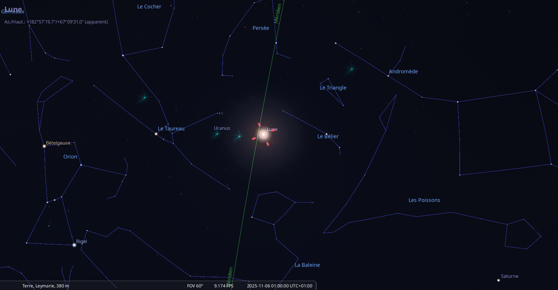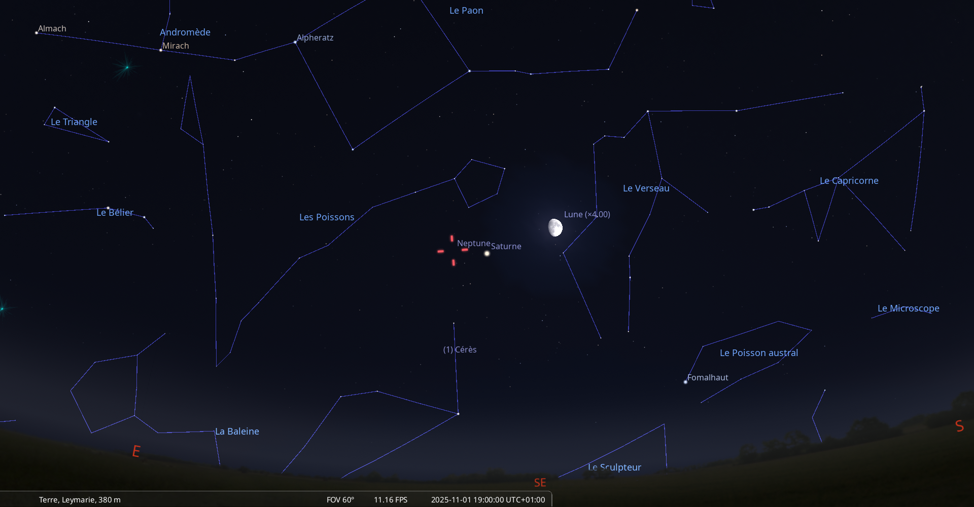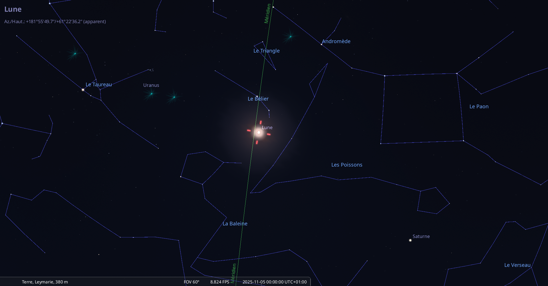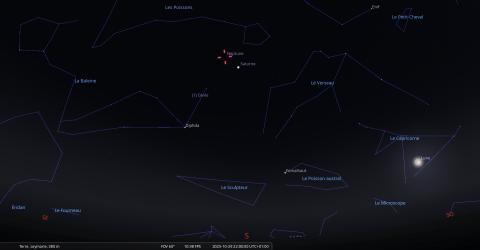La nuit du 1 au 2 novembre, la Lune culmine à 21h24 et Saturne à 21h54 pour notre localisation ;