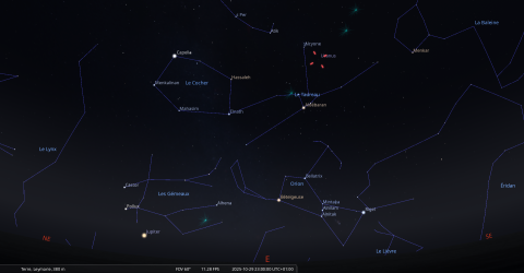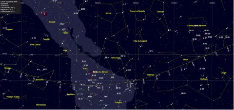 – A 4h13, la Lune arrive devant la constellation du Capricorne (Cap) ; longitude 299°38’ (30e CAP) ; latitude -23°47’, monte