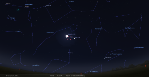 Les deux astres sont alors à 32° de hauteur environ au Sud-est ; la portion éclairée de la Lune est de 81%