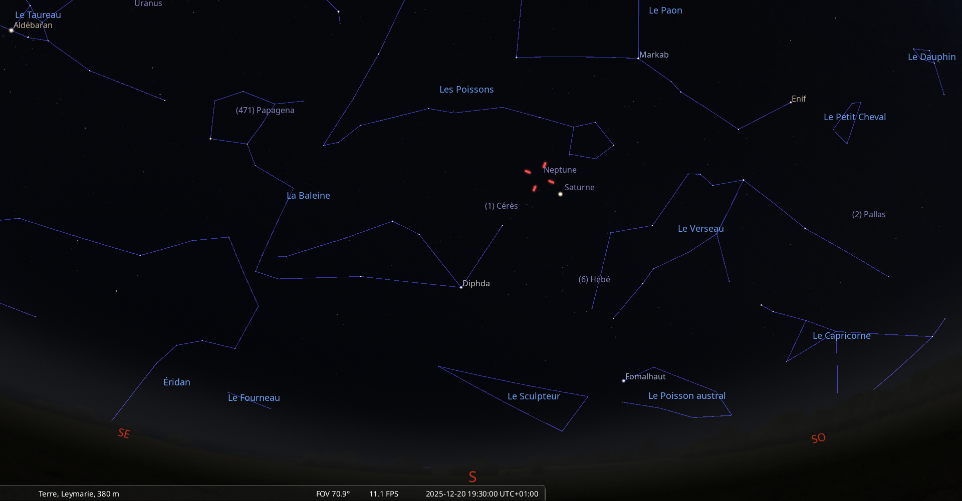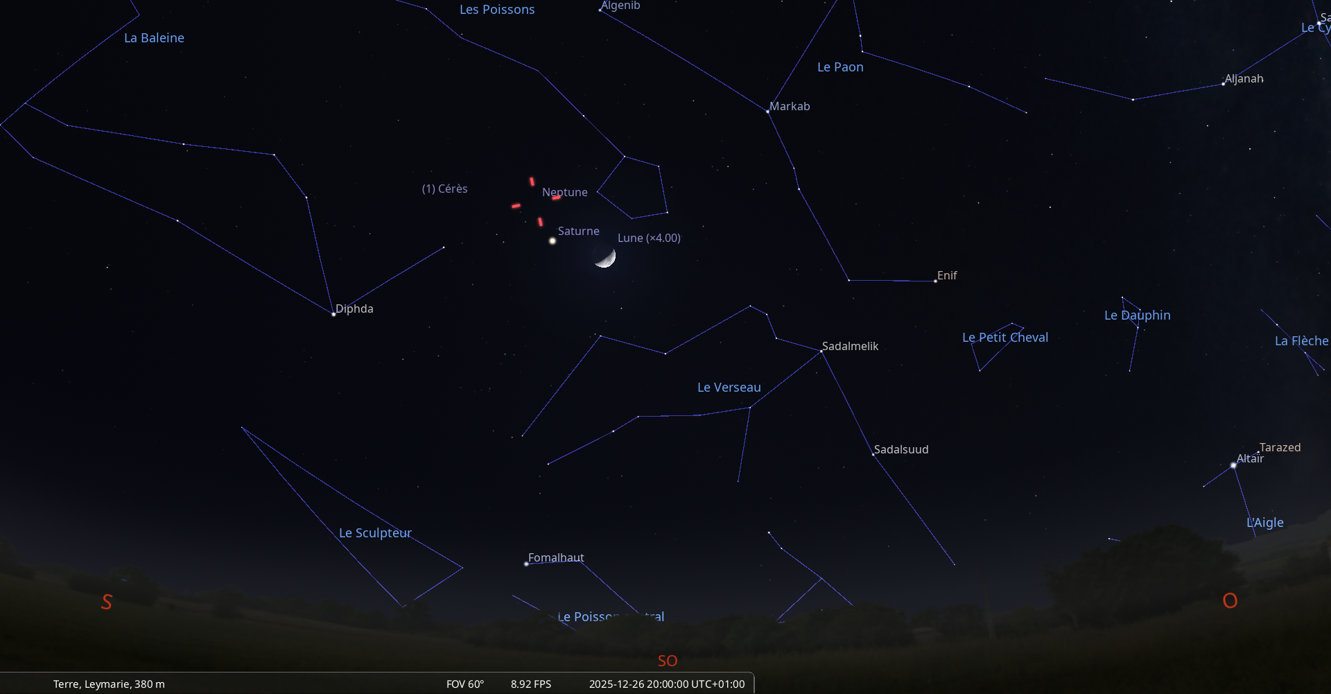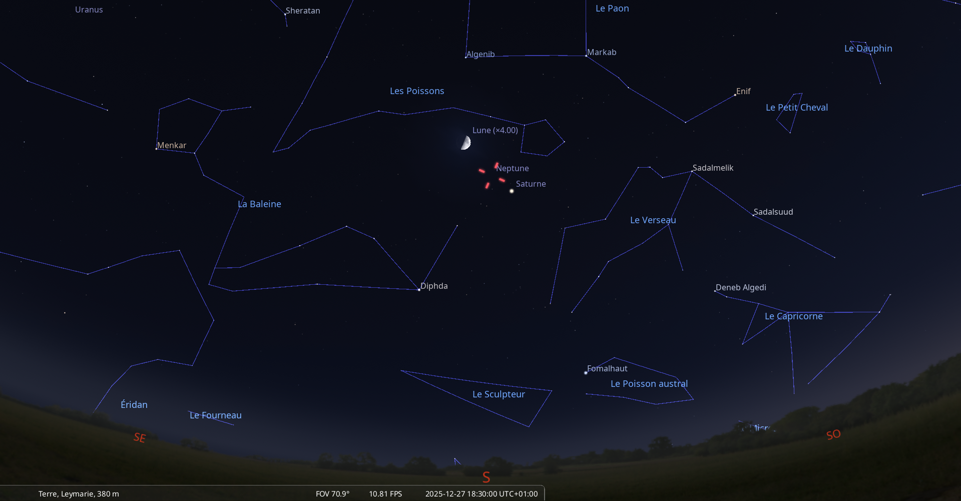 La nuit du 26 au 27 décembre, pour notre localisation, Neptune culmine à 18h29 et se couche à 0h26.