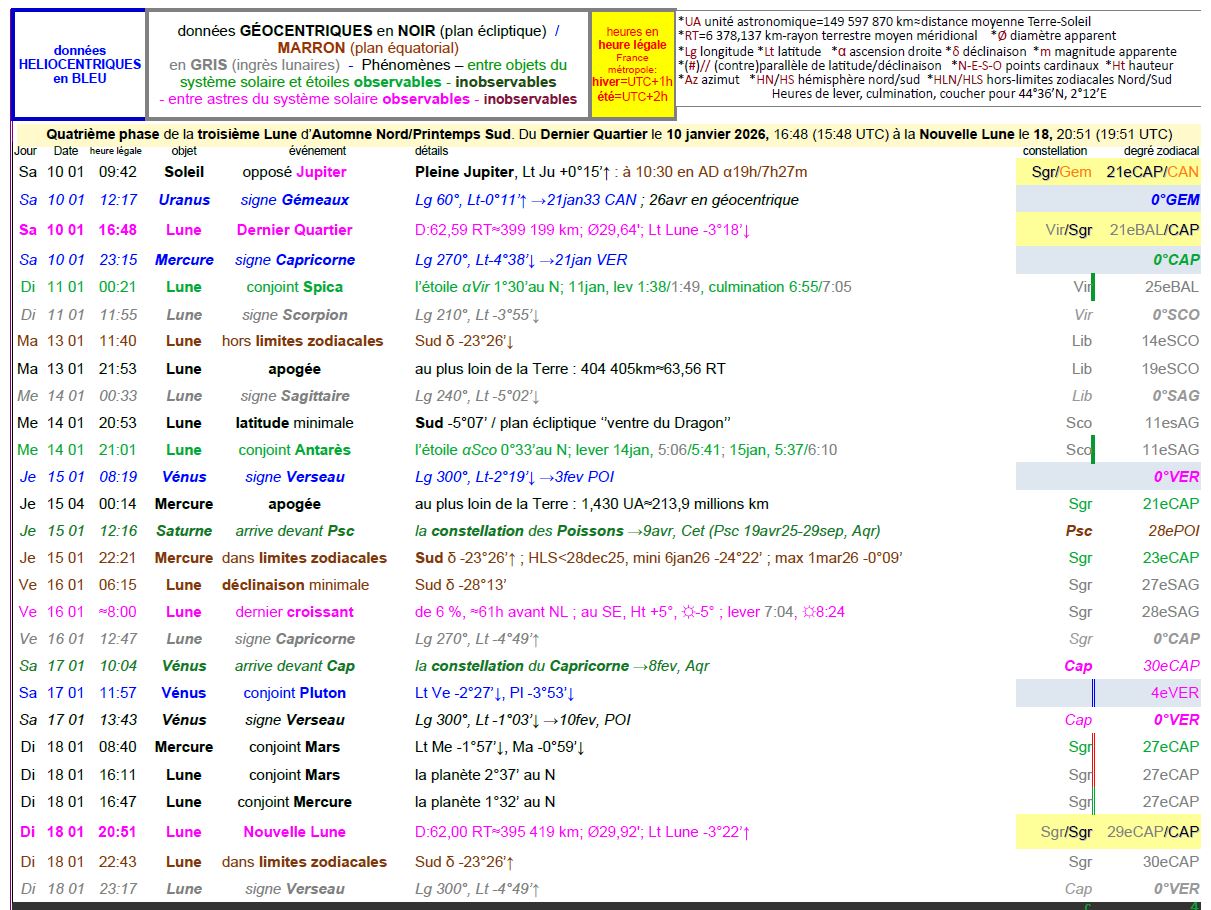 – A 12h47, la Lune entre dans le signe du Capricorne ; Lg 270° à 300° ; sa latitude est alors de -4°49’, monte.
