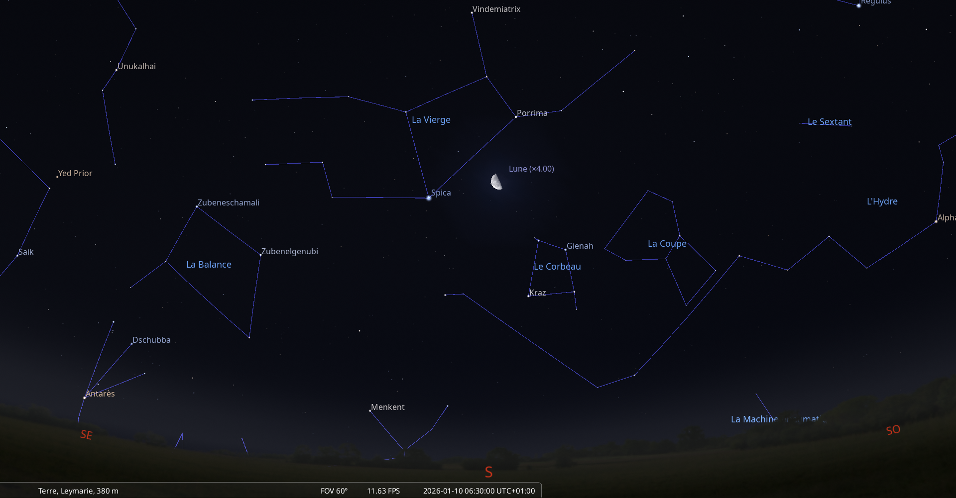 - A 6h03 (pour notre localisation), l’étoile Fang - 6 Sco (constellation du Scorpion), magnitude 2.9,