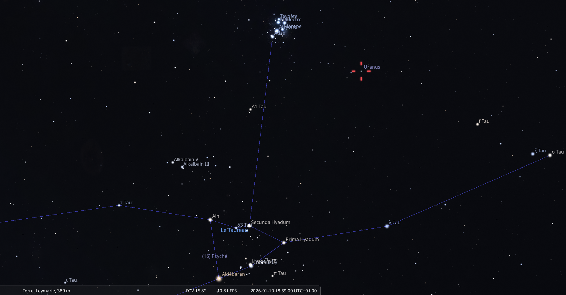 Le 15 janvier, Antarès se lève, comme invariablement, 4 minutes plus tôt que la veille, à 5h37 et la Lune, passée à sa gauche, à 6h10.