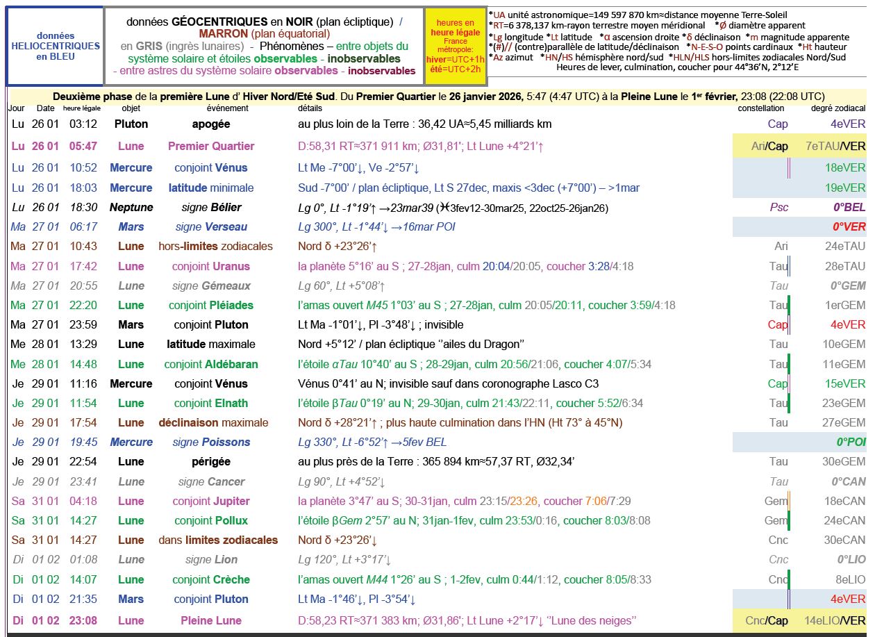 - A 10h43, la Lune sort des limites zodiacales Nord (+23°26’18") ; ascension droite 3h 18m ;